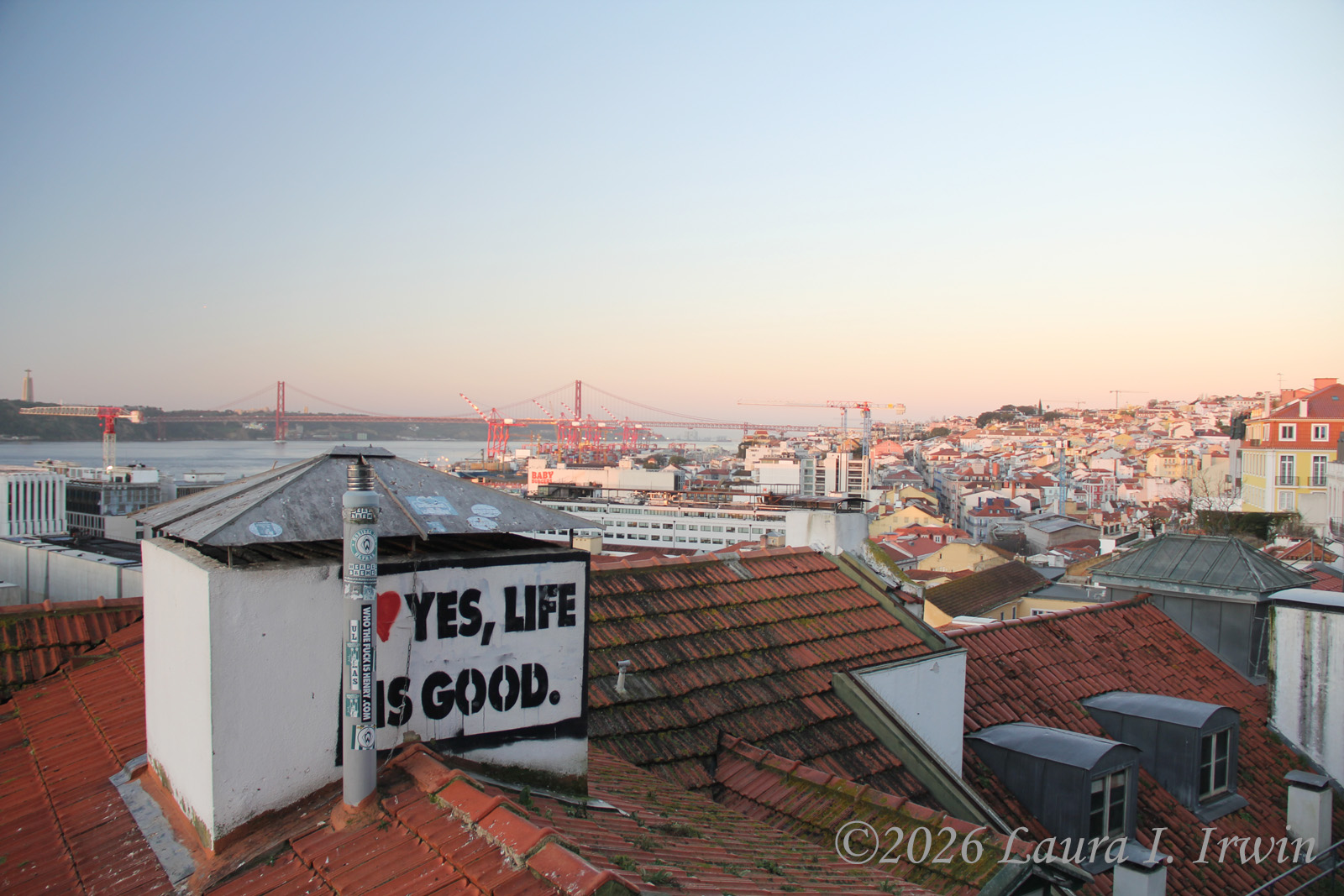 I had to leave my hotel by 8AM to head to the airport this morning, but I was out of bed and up at Miradouro de Santa Catarina for sunrise at 7:20AM. It’s not the prettiest viewpoint, but it was close to my hotel (straight up several flights of stairs) and gave me a chance to spend a few minutes reflecting on my time in Lisbon before heading home.