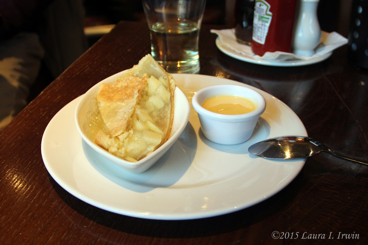 Afterwards, I walked towards Trafalgar Square. Not being a city person, the crowds soon turned me around. I decided to set off for Westminster Abbey and joined the queue already forming for the Evensong service. If you’ve never been to Westminster Abbey, put it on your bucket list. I did a verger tour on my last trip here, and it has remained one of the highlights of that trip. The history and atmosphere alone are worth a visit. Since photos are not allowed, this 360° panorama is at least a look at what’s inside: http://a.abcnews.com/flash/interactives/westminsterpano/tour.html Of course, by this time, I was past the point of exhaustion. Not that I didn’t enjoy the service, but it was somewhat overshadowed by the constant reminder to myself that it wasn’t bedtime yet. After leaving Westminster Abbey, I high-tailed it back to the hotel for a quick pit stop and then sought out a recommended pub – The White Lion – close to the Pimlico tube. It did not disappoint. Especially the apple pie! 🙂 All in all, a successful first day in the U.K.!