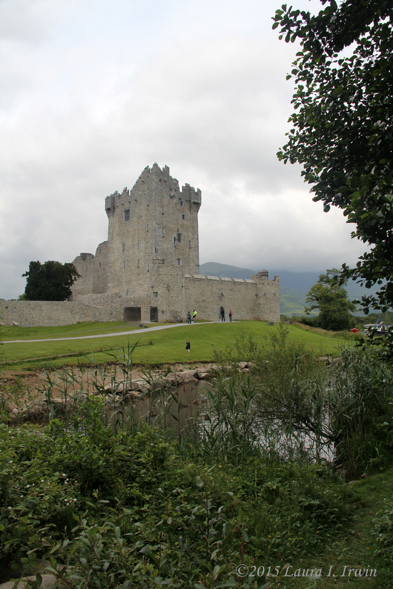 My next stop was Ross Castle, built in the 1400s by the O’Donoghue family. The only way in is by guided tour, but I learned a lot and used my Heritage Card for free admission. Ross Castle is a tower house, and is 4 stories tall. The ground floor was used for weapons storage and has very narrow windows for shooting arrows. Above that is the main family room. On the third floor is the bedroom (the entire family shared one room – adults in the bed and kids on the wooden floor), and the top floor was the banqueting room. The servant quarters were in one small room with one small window that housed about 25 servants at a time. I was particularly fascinated by the “murder hole”, a small hole above the main entrance through which objects could be dropped to murder unwanted intruders, and the bathroom, which consisted of one long bench with an open grate through which waste fell into a chute outside. It was one servant’s job to monitor the waste. The staircase in the castle was counterclockwise with uneven steps for two reasons. First, most soldiers were right handed, so coming down the stairs, they had the advantage over intruders coming up. Second, the uneven steps were called “tripping steps” to again throw off would-be intruders who would trip up the uneven steps.