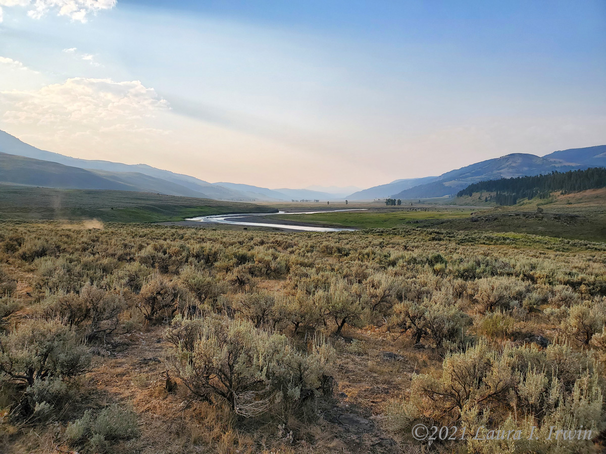 I drove back to Gardiner after my second breakfast because it was getting hot and I needed to change into shorts and I forgot to bring my sunscreen with me this morning. The temperatures here are cool overnight – it was in the low 50s when I left this morning – but warm up into the 80s by afternoon. By the time I was ready to head out again, the sun was almost nonexistent thanks to the smoke and haze in the air.