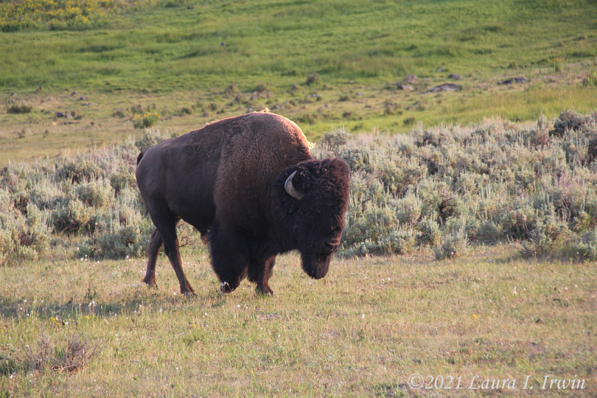 Since animals are most active at dawn and dusk, I knew being in the park early would give me the best chance to see wildlife. And I did! I saw bison aplenty, elk, ground squirrels, bighorn sheep, and a black wolf (sadly, the wolf was too far away to get a good photo, even with my telephoto lens). I stopped to soak in the scenery in the beautiful Lamar Valley and made several stops for photos along the route from Gardiner to the northeast entrance of the park, near Silver Gate and Cooke City, Montana.