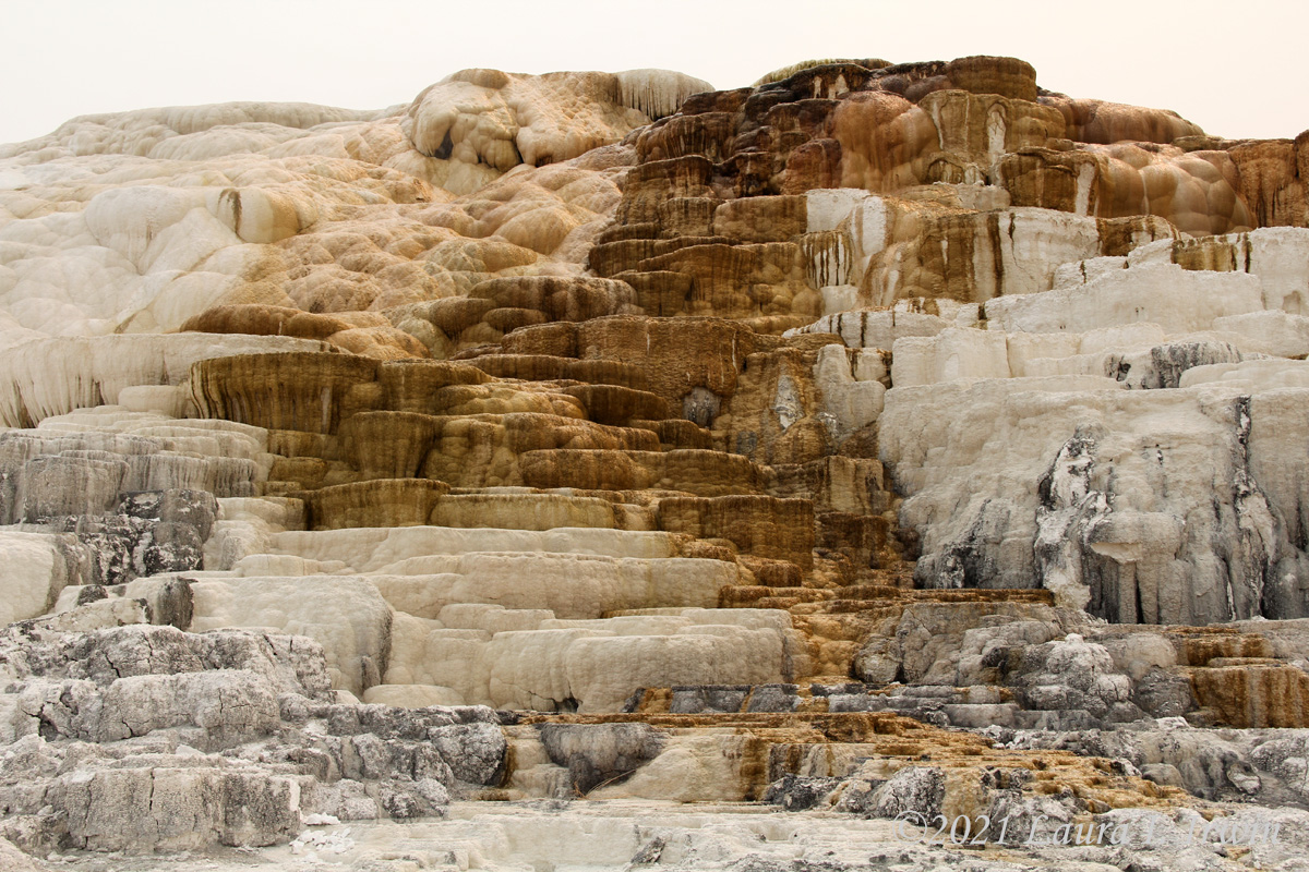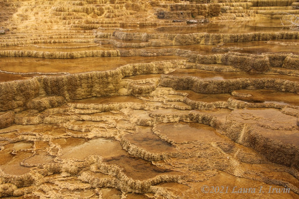 The afternoon found me taking a quick walk around Gardiner (it’s not very big) and then exploring the travertine terraces of Mammoth Hot Springs. The otherworldly formations are created by limestone dissolving in hot springs underground and the formations themselves as well as the runoff from them vary in color from white to “gold” to brown. The walk around the lower terraces is about 1.5 miles in addition to the climb to the overlook. I made a brief stop after my walk to take pictures of the elk in the village of Mammoth and then headed back to Gardiner for dinner.