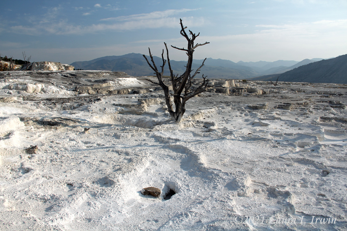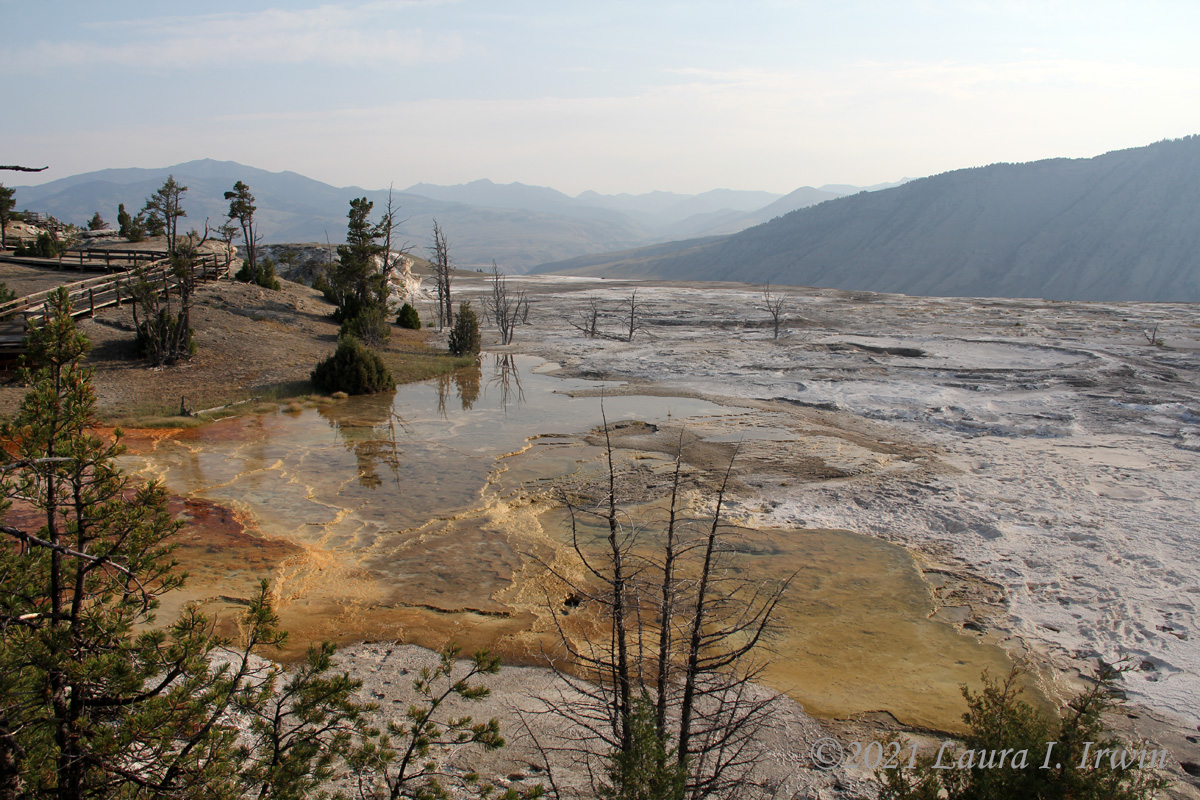 I slept in ‘til 4 this morning and was in line for breakfast at the Yellowstone Grill when it opened at 7AM. My only breakfast for today of biscuits and gravy, scrambled eggs, and hash browns gave me some much-needed fuel for the day. Once I hit the road, I went back to the upper terraces at Mammoth Hot Springs because the clear blue sky this morning made the colors really pop.