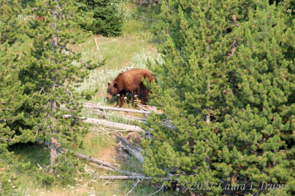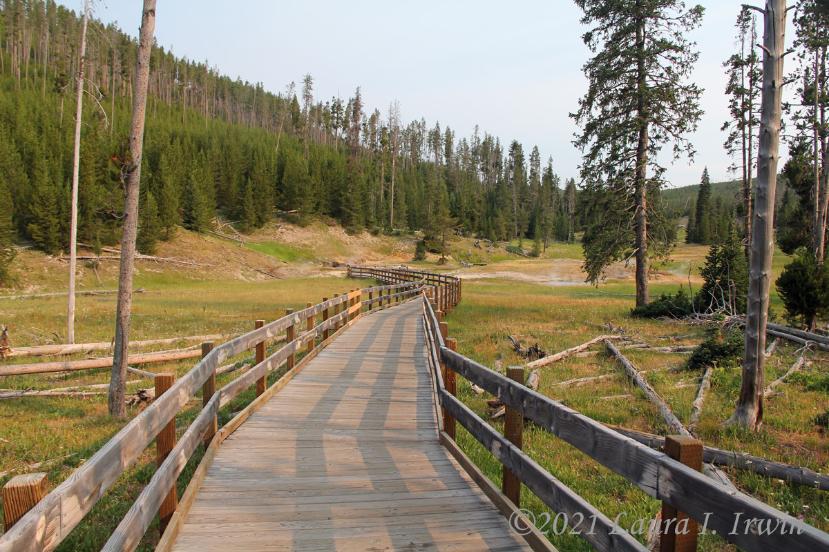 Then it was off to the Norris Geyser Basin. Along the way, I encountered the tell-tale sign of wildlife nearby in Yellowstone: lines of cars pulled off on both sides of the road. Everyone was talking about the bear that had just disappeared into the woods. I waited around for a few minutes, hoping to catch a glimpse, before deciding to walk the short boardwalk to Clearwater Springs just down the road. I moved my car to the nearby pullout and headed down to see the spring. I took a few photos, looked up, and… there was the black bear along the tree line across the creek. It wasn’t super close, but it certainly wasn’t far either. At that point, I was more interested in retreating back up the boardwalk than in taking pictures.