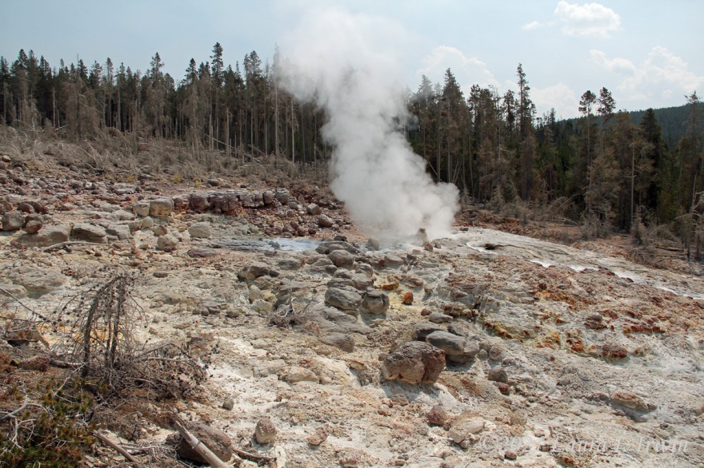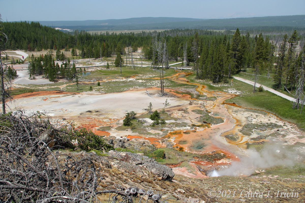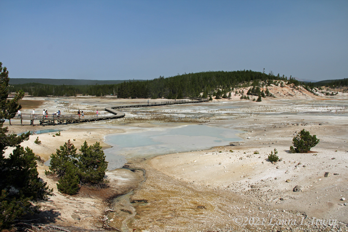 Norris is broken up into two basins with a loop walk around each. I started with the 0.6 mile loop around Porcelain Basin, an open area with all manner of springs, pools, geysers, and fumaroles. Every pool/spring was a wonder of colors and the constant sound of steam blowing out of the underground vents provided a great background “soundtrack”.