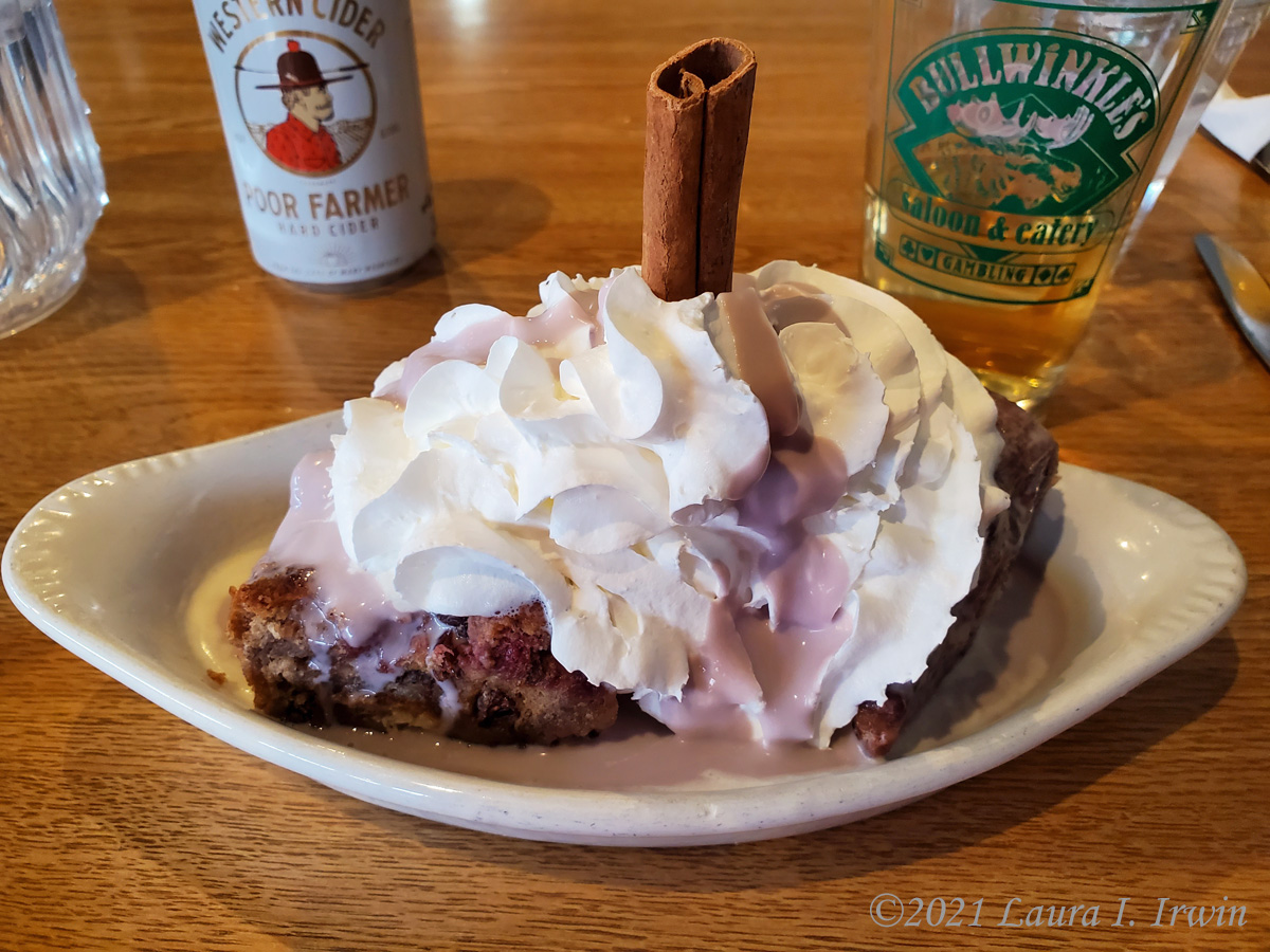 I took a quick swim in the hotel pool and then made my way to Bullwinkle’s for dinner. Another cheeseburger and local cider formed my main meal, but the huckleberry bread pudding was the star of the show!