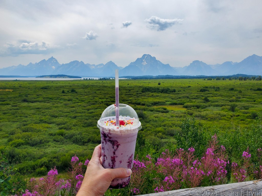 The rest of my drive south through Yellowstone was uneventful. I stopped to watch a field of bison and walk around the West Thumb Geyser Basin. As I approached Grand Teton National Park, the sky turned somewhat cloudy, but the Teton Range rising to the west was still breathtaking. I knew I needed to test out the huckleberry shakes at Jackson Lake Lodge, and a stop there seemed like the perfect start to the second half of my trip. Not only was the shake delicious and loaded with sweet huckleberry flavor, the view of the Tetons from the bench I chose at the back of Jackson Lake Lodge can’t be beat.