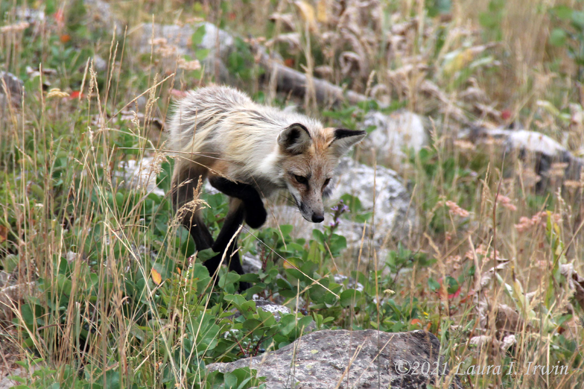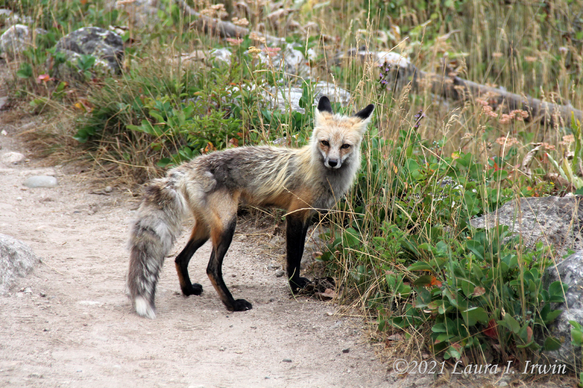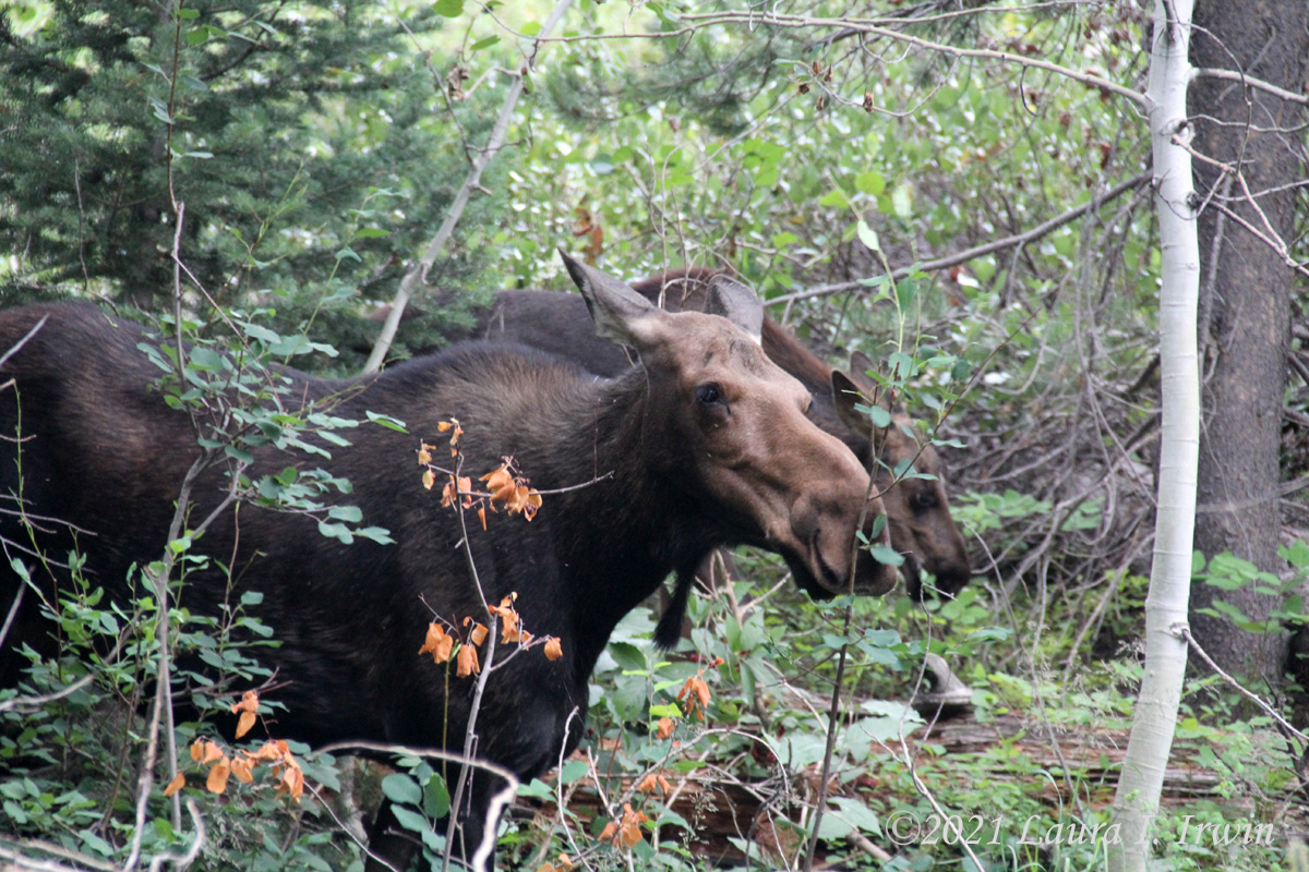 Raining. It was raining when I walked outside. Sure enough, my weather app indicated mostly cloudy skies with an 85% chance of rain and thunderstorms. So not exactly great weather for hiking. My plan B ended up being to drive out the Moose-Wilson Road to see if I could spot any moose (nope) and then just drive around the park. When I got to the Taggart Lake trailhead, I decided to just go for the hike anyway. It turned out to be a great idea because within the first mile, I saw a fox and a mother moose and her calf!