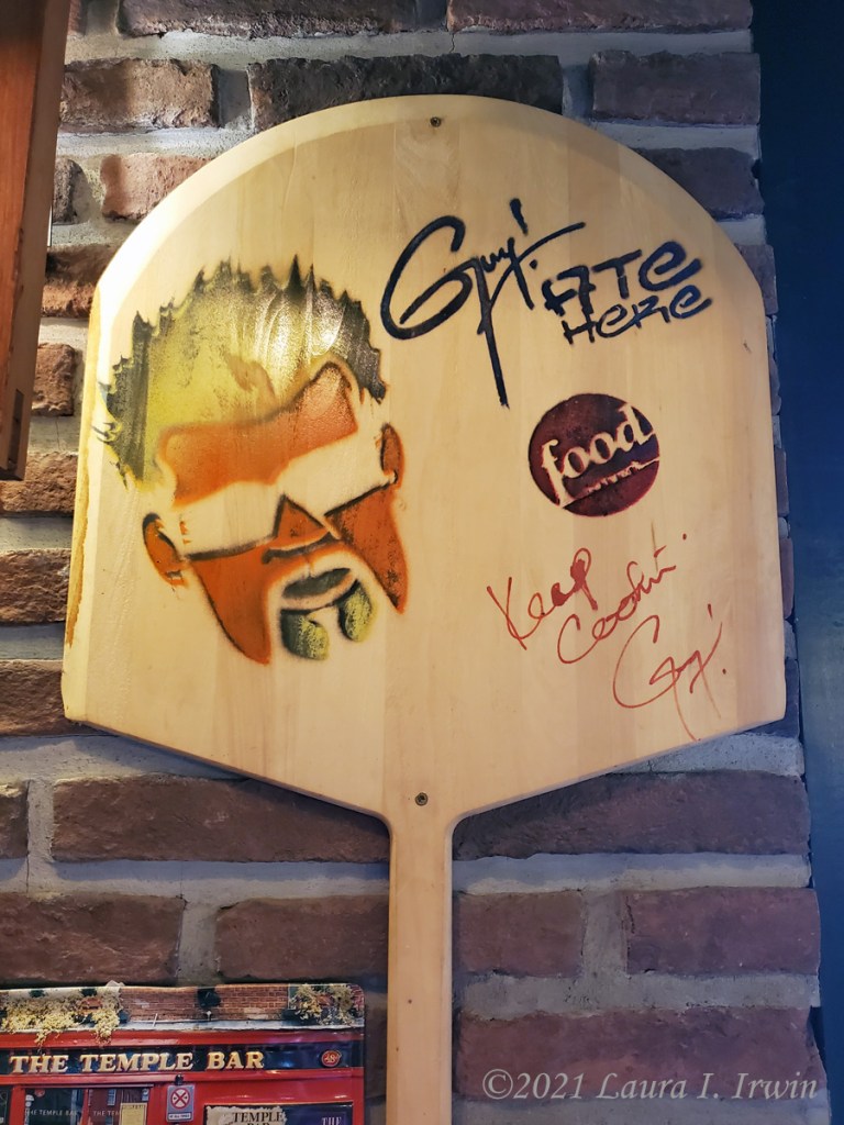 After a rest and shower, it was off to dinner. My originally chosen restaurant had an hour wait (before 5PM; welcome to Jackson Hole), which is how I came to be eating a “Guy’s Pie” at Pinky G’s Pizzeria. The Pizzeria was featured on Guy Fieri’s “Diners, Drive-Ins, and Dives”. How could I not order his eponymous pie? Featuring mozzarella, bleu cheese, chicken, and pepperoni, what was not to love about it? I need to head to bed early tonight, as I have a full morning planned tomorrow!