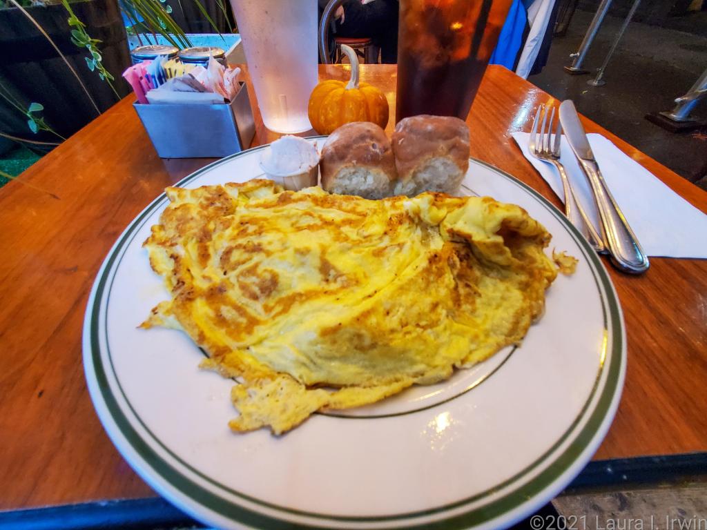 Saturday found me dodging raindrops as I made my way through Central Park and the Upper West Side en route to my breakfast destination, Good Enough to Eat. As the name suggests, the food was good enough to eat, but I wouldn’t add it to my amazing breakfasts list. I opted to eat on the enclosed streetside patio and chose a combination I’ve never had before: a “Gramercy Park” omelette filled with Granny Smith apples and cheddar cheese. While I was intrigued by the concept, I can now say that – in my opinion – apples do not belong in omelettes. The omelette was accompanied by homemade biscuits with strawberry butter. The strawberry butter added a fruity sweetness to the biscuits that elevated them well above the omelette.