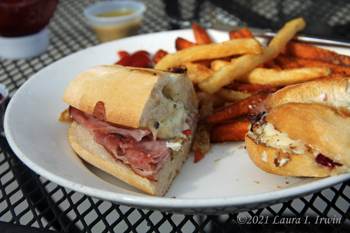 Café Karibo – I had decided on Café Karibo before my trip after looking at the menu online. I decided to head there for lunch after my boat trip on Wednesday. The “20-30 minute wait” ended up being 45 minutes. Once I was comfortably seated on the outdoor patio, I quickly ordered a lemonade cocktail with ginger beer and lemon vodka to accompany a warm ham and brie sandwich. The drink was good, but I’m not a big fan of ginger, and it was pretty strong on the ginger flavor. When my sandwich arrived 30 minutes later, my plate was lacking the cranberry relish and honey mustard I had asked to be put on the side and the mix of regular and sweet potato fries were lukewarm. Strike two for my meals.