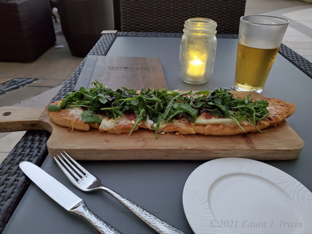 Seaglass – I was disappointed that room service wasn’t available during my stay at the Omni because I was looking forward to having a quiet dinner on my balcony when I arrived on Tuesday night. However, the lobby bar/lounge, Seaglass, had small bites available and some outdoor seating. I was given free drink coupons on arrival at the hotel and made good use of one for an Angry Orchard cider (slim pickings on the cider front), and selected the Iberico Flatbread for dinner. The flatbread was topped with goat cheese, iberico ham, sliced apples, arugula, and a balsamic drizzle. The mix was incredibly delicious with the bitter arugula offset by the salty ham and sweet balsamic. I capped it off with a lemon blueberry custard cake which was just a little too tart for my liking.