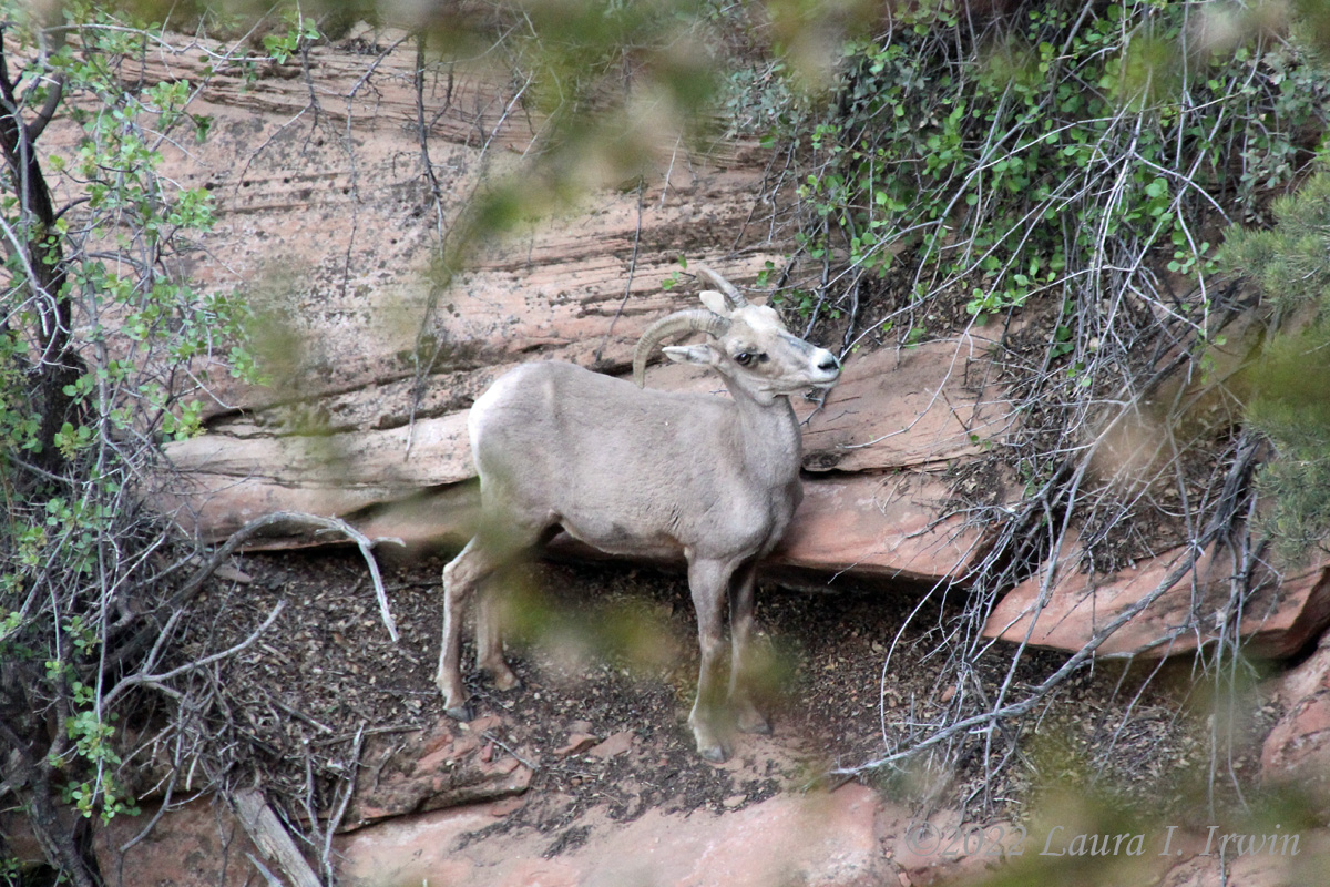 The hike back was much brighter and I found myself stopping frequently to take pictures. The early morning light casts a pink and golden hue on the sandstone cliffs; a photographer’s dream. I was also treated to a group of bighorn sheep grazing in Pine Creek Canyon below the ledge.
