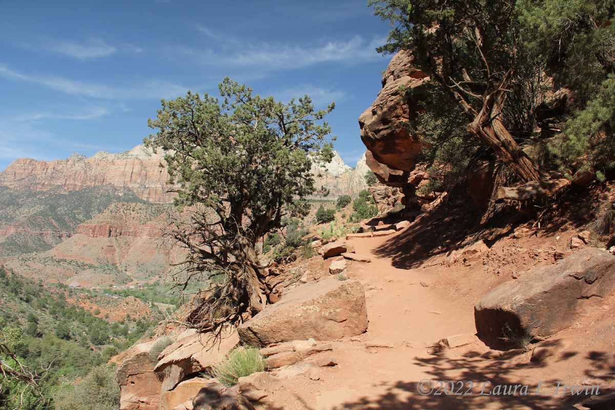The Watchman Trail travels 1.5 miles from the Visitor Center to a viewpoint overlooking the iconic Watchman rock formation. While not the most impressive hike in the park, with the sun now high in the sky, it was both hot and tiring. The trail climbs steadily up, through a series of switchbacks and curves, to its highest point. A 0.3 mile loop at the top affords views over Springdale and the entrance to Zion Canyon.