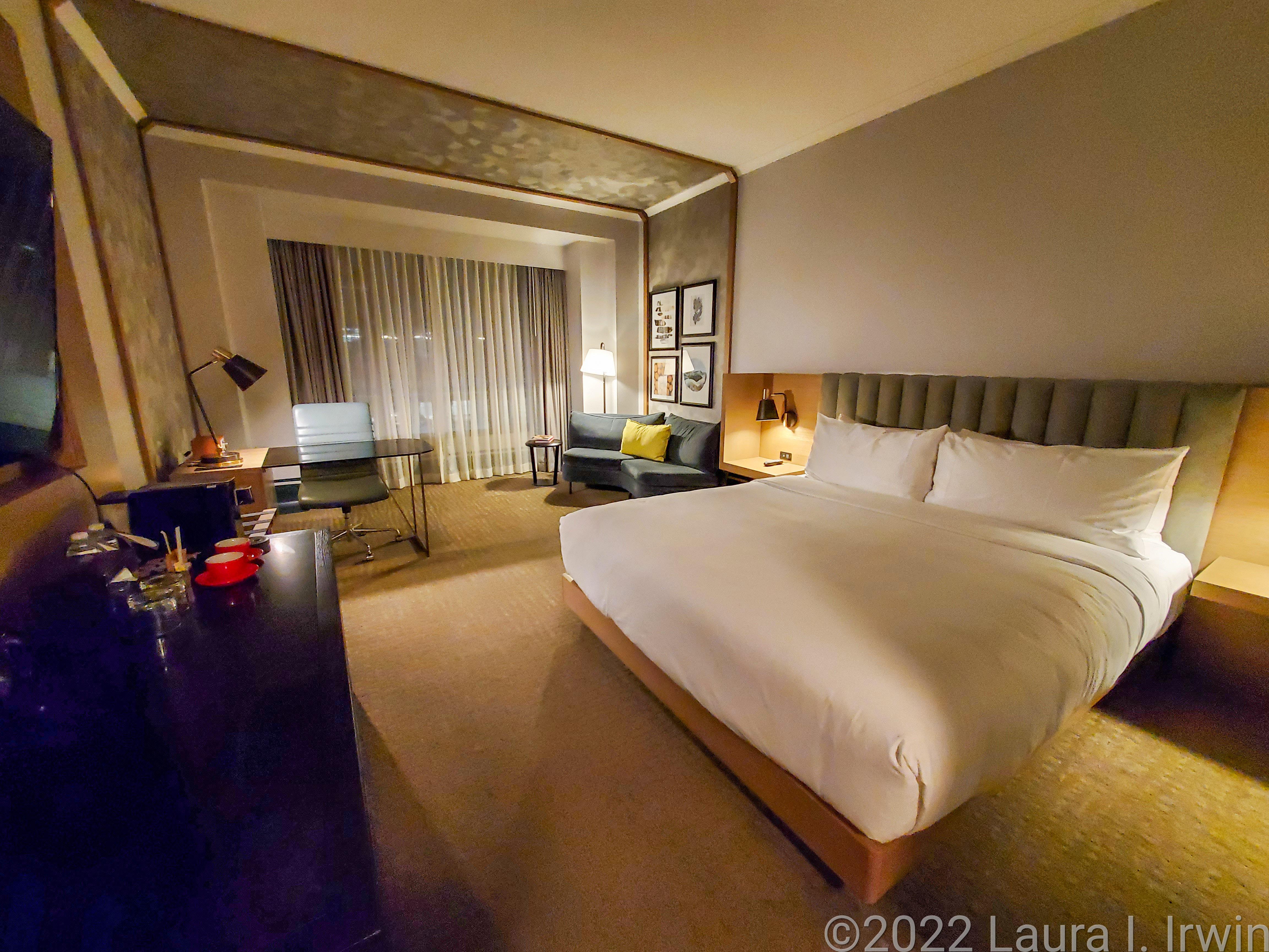 My hotel for the first part of my vacation is The Duniway in Portland, a boutique Hilton hotel just a block away from Pioneer Courthouse Square. While the room is spacious and well-appointed, it’s also very dark. Not so much dark furniture or decor, just a lack of lighting.