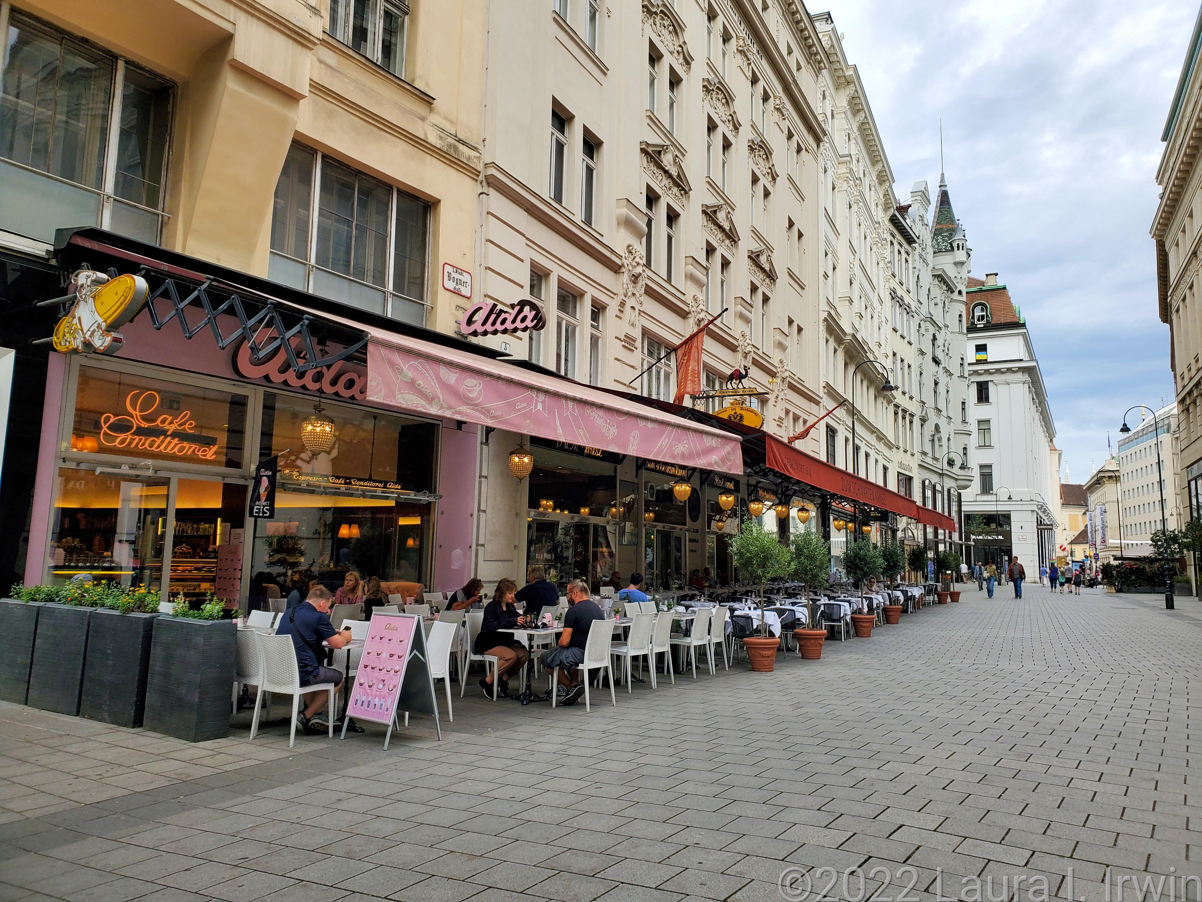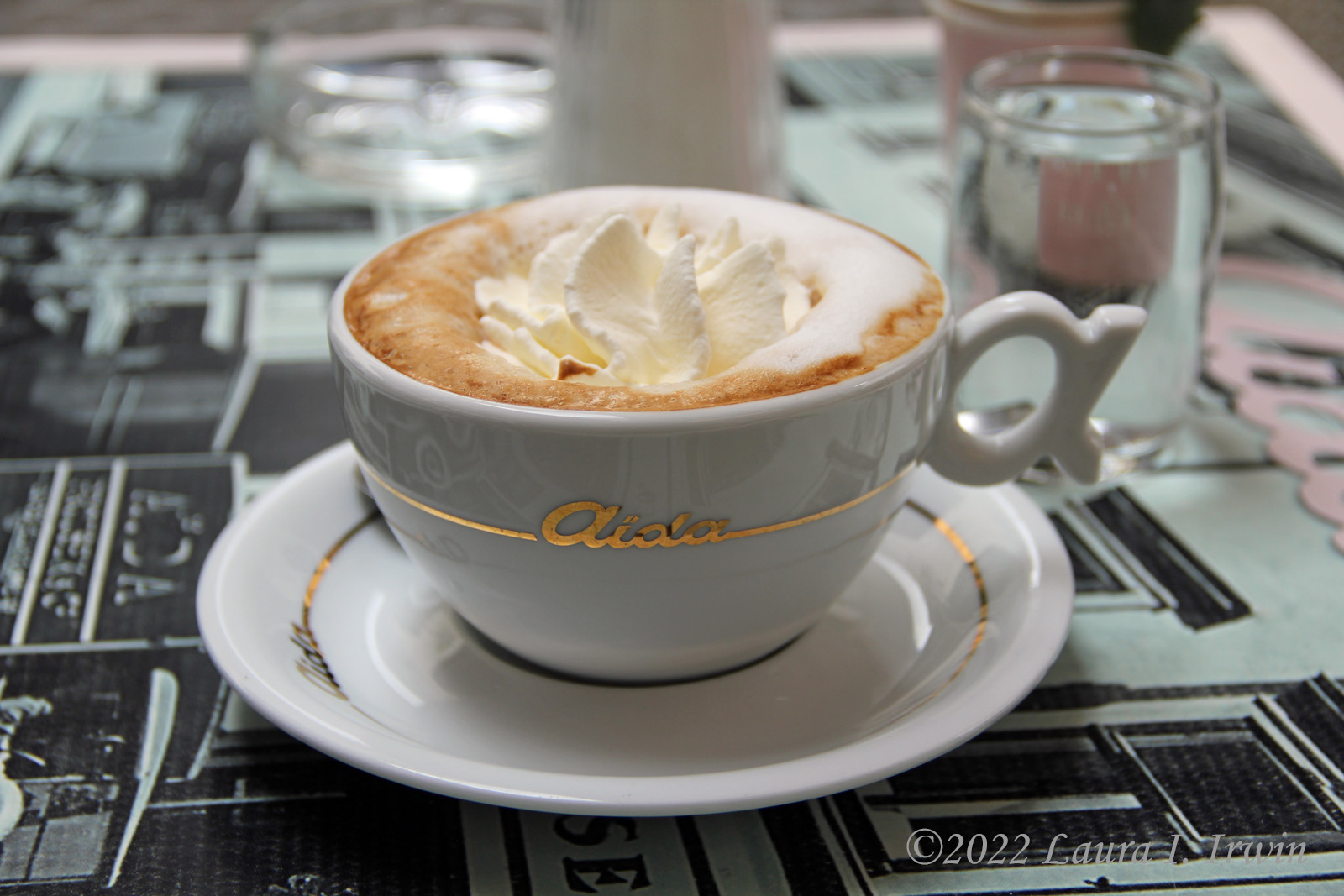 One of the things I did want to do today was enjoy a Viennese coffee at a café. I ended up sitting on the patio at another Aida café to enjoy an Aida melange. This would probably be a good time to point out that I’m not a coffee drinker. I like iced coffee well enough (with copious amounts of cream and sweetener), but plain hot coffee? No, thanks. As a non-coffee drinker, Aida melange sounded like my best choice… coffee with milk, milk foam, and (unsweetened) whipped cream. Plenty to offset the coffee flavor. I managed to drink it, thanks to the large amount of sugar I added, but Vienna has not turned me into a coffee lover.