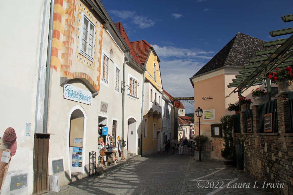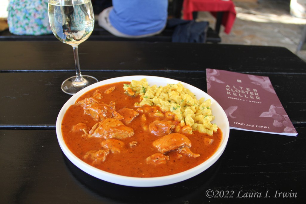 I resisted Googling “best restaurants in Dürnstein” and decided to just walk around until I saw something appealing. Being a small town, with a population of less than 1,000, the options were limited. A sign caught my eye pointing to Alter Klosterkeller, and I recognized it from my list of places to try that I compiled before I left home. The name literally translates to “the old monastery cellar”. The restaurant patio and tables are situated right in the small vineyard and you can look out across the vines to the other side of the valley while you eat. I was adventurous with my meal, eating a spicy paprika chicken with spaetzle and ending with a marillenknödel, a specialty of the area, which is an apricot dumpling. Both the food and the setting were incredible and it was one of those evenings I didn’t want to end.
