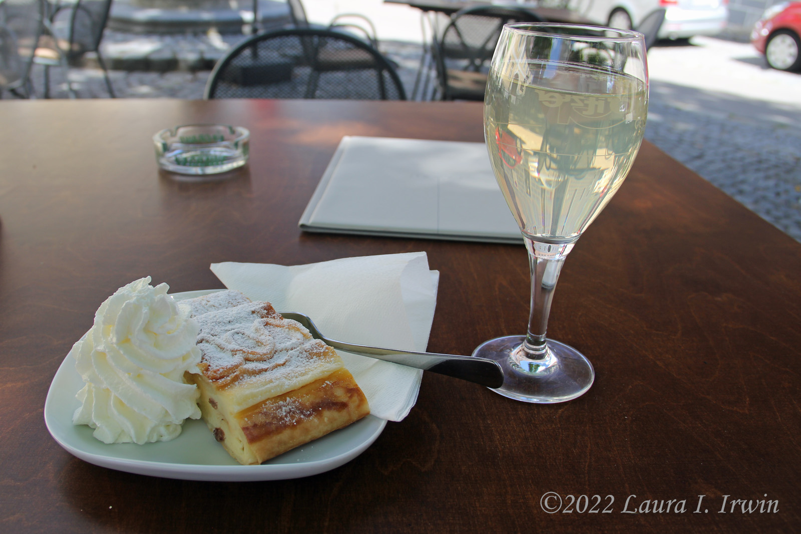 I stopped a few times on the way back from the castle and eventually found myself in Rossatz, a little town just across the river from Dürnstein. There is a little cafe (Tinis Kaffee Eckerl) that had tables set up on the Kirchenplatz (church square). It was there that I indulged in my first Topfenstrudel, or cheese curd strudel. Cheese curds here are not like the “squeaky cheese” we have in the US (though I do love those!). Here it seems to be more like a ricotta or cream cheese, called a “farmer’s cheese” in recipes. If possible, I think I like Topfenstrudel even more than apple strudel!