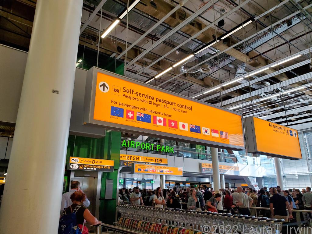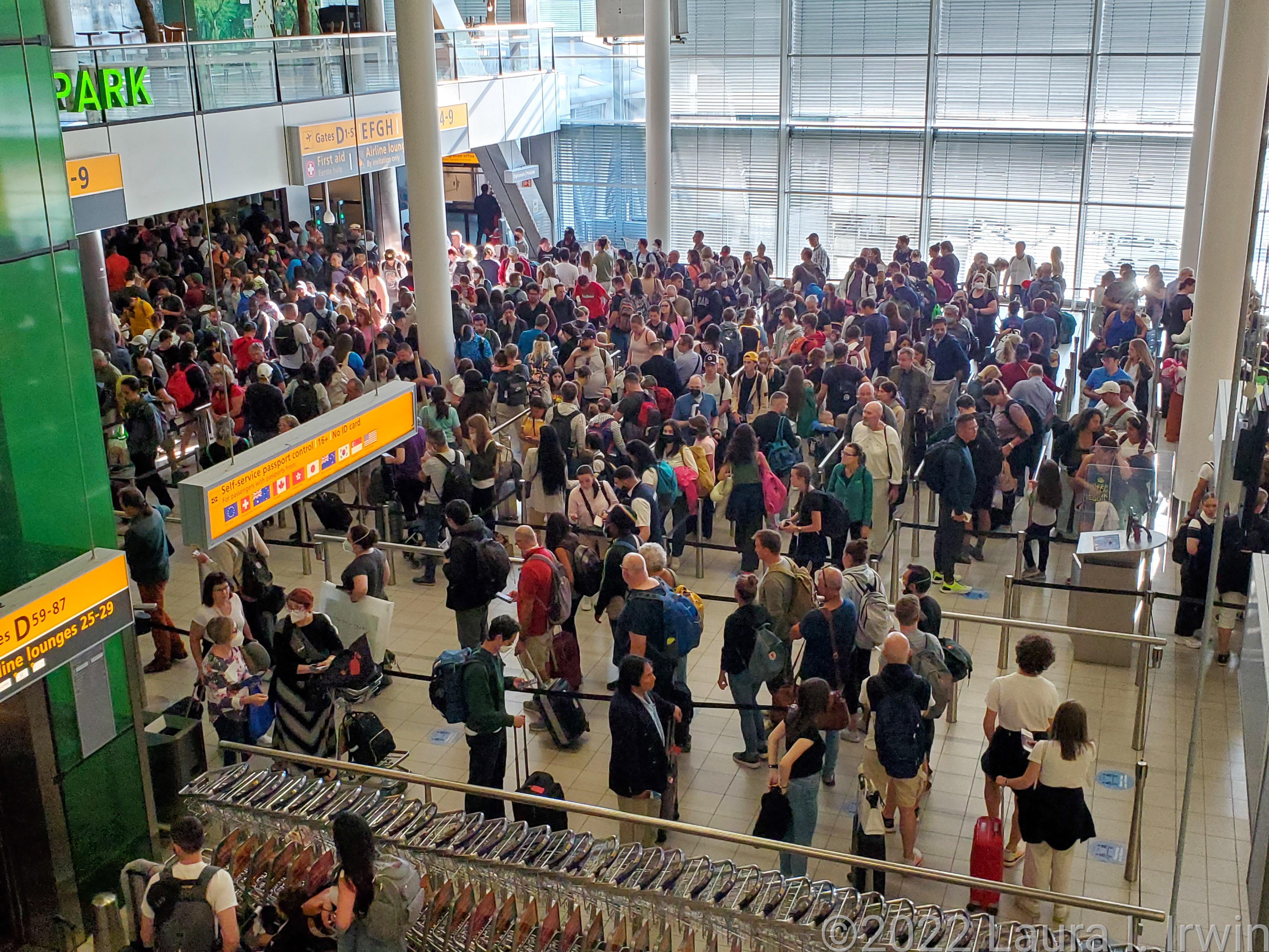 You’ve no doubt read the stories and seen the pictures of the ridiculously long security lines at European airports this summer. I encountered similar lines to go through passport control in Amsterdam. Fortunately, the self-service lines moved pretty quickly and I got my departure stamp from Schiphol Airport.