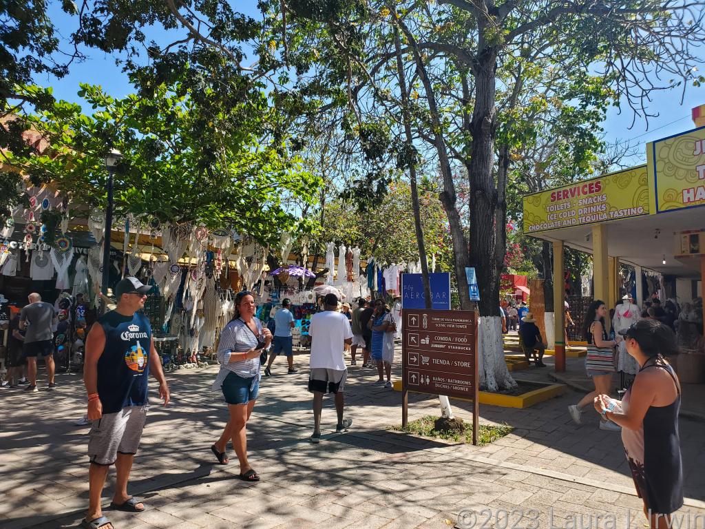 It takes about an hour to reach Tulum from Playa del Carmen. Once there, we parked among the masses of buses and tour vans and met up with others from the same tour company. The area outside the ruins is not unlike 5th Avenue in Playa del Carmen, with a mix of souvenir shops, street vendors, a couple of restaurants, a Starbucks, and even a pharmacy (they’re everywhere here!).