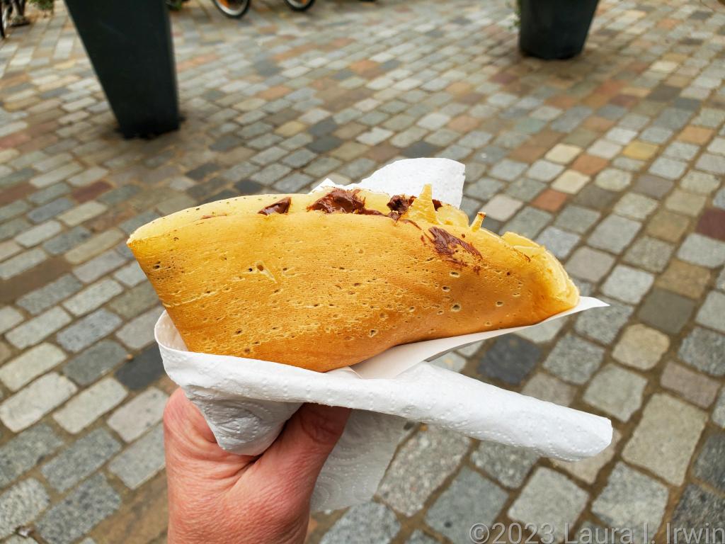 I decided I didn’t have the energy for another full meal today, so instead, I ate my way back to my hotel. I first stopped at a place I had walked by earlier, Viandas de Salamanca. It is a charcuterie type shop, and they had little paper cones of chorizo, salami, cheese, and ham in the window. I really wanted a cone of ham and another of cheese, but for some reason, the gentleman told me I couldn’t buy one of the ham ones. He suggested I could come back in 10 or 15 minutes and maybe I could buy one then. It left me puzzled, but I walked away with some cubed cheese in a cute little paper cone. I have been nibbling on it all afternoon. Then it was off to a little crepe stand (Mich Sandwiches) in Place Saint-Michel that I went to several times when I was here last. There’s probably nothing special about it, but the woman who worked there at the time was so sweet and it was the first thing I ate when I arrived on that visit. The stand is still there; the woman wasn’t (at least not today). I enjoyed my Nutella crepe while I headed back toward my hotel.