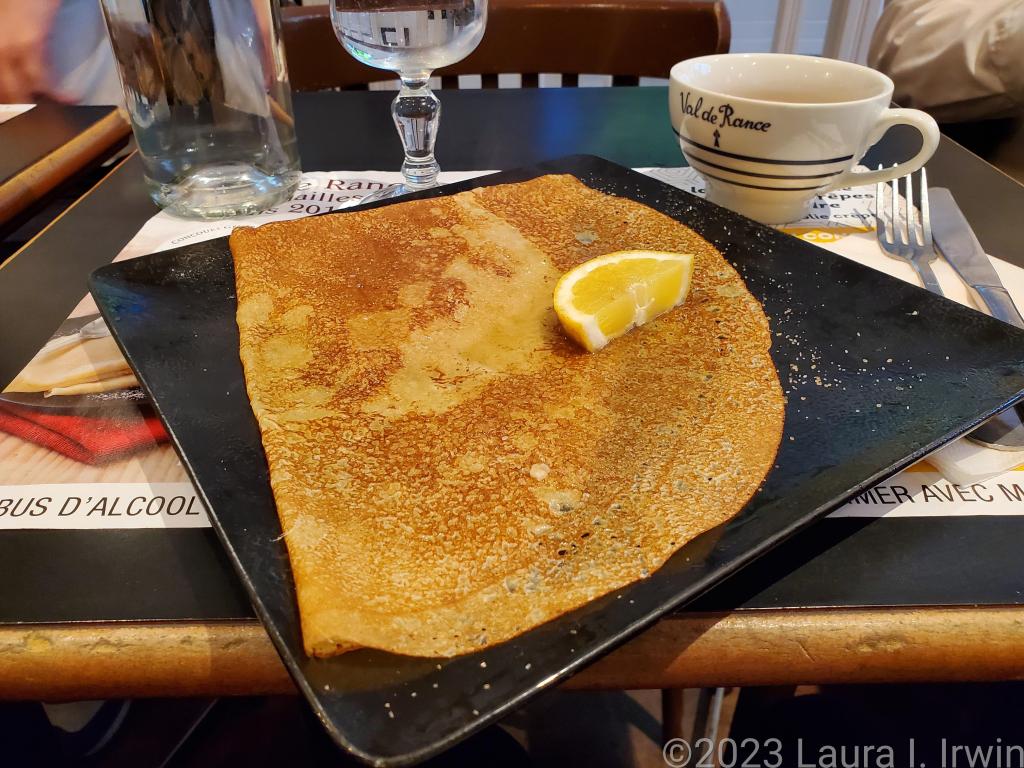 Then I stopped at La Crêperie du Clown for a lemon and sugar crepe and a glass of French cider (or cidre, as they call it here). Before heading back to my hotel, I stopped at Monoprix to get a soda, yogurt, and pastry so I can eat breakfast in my room tomorrow. I have to be at the train station (relatively) early for an outing to visit some famous gardens… any guesses where I’m going?