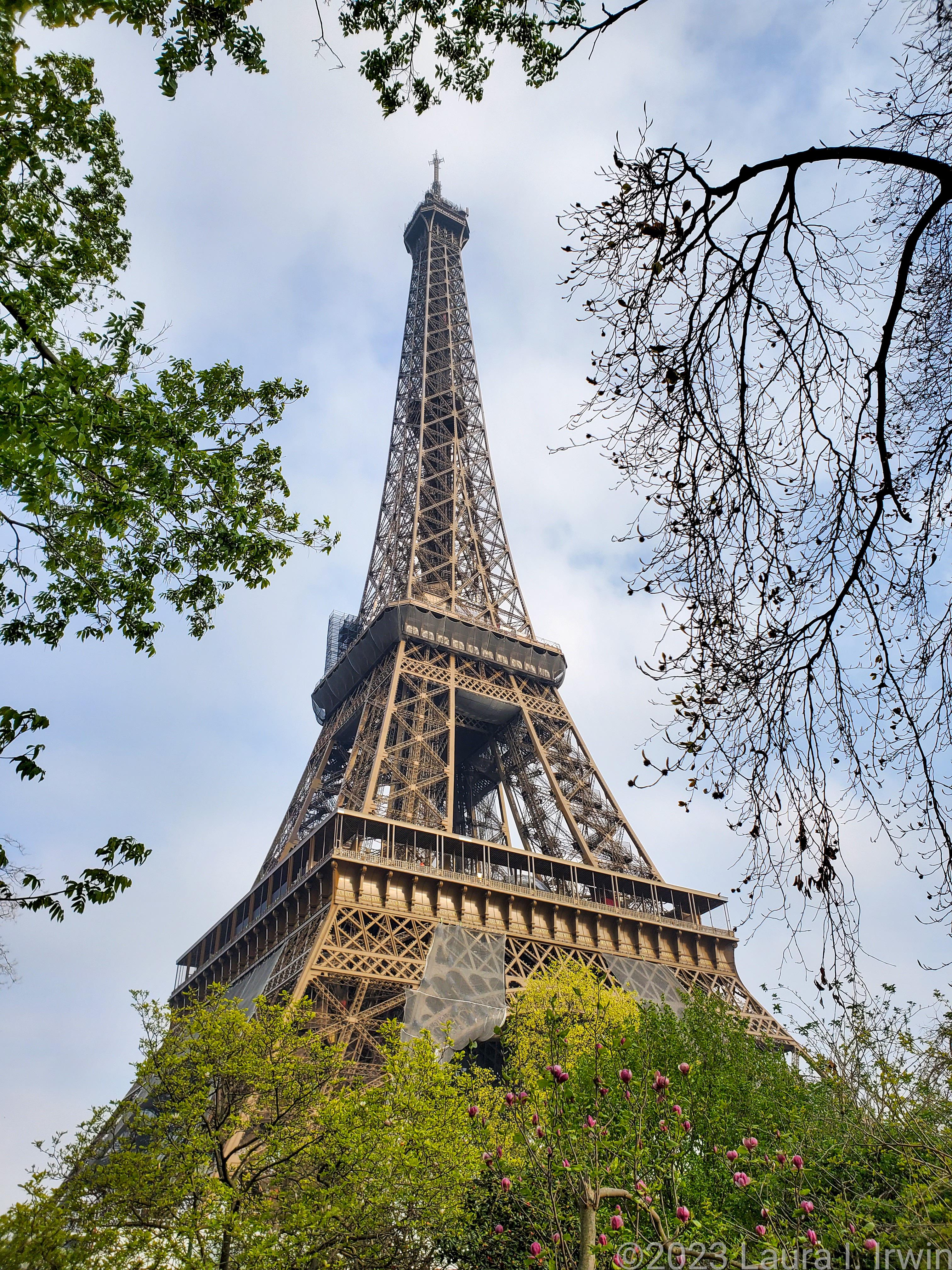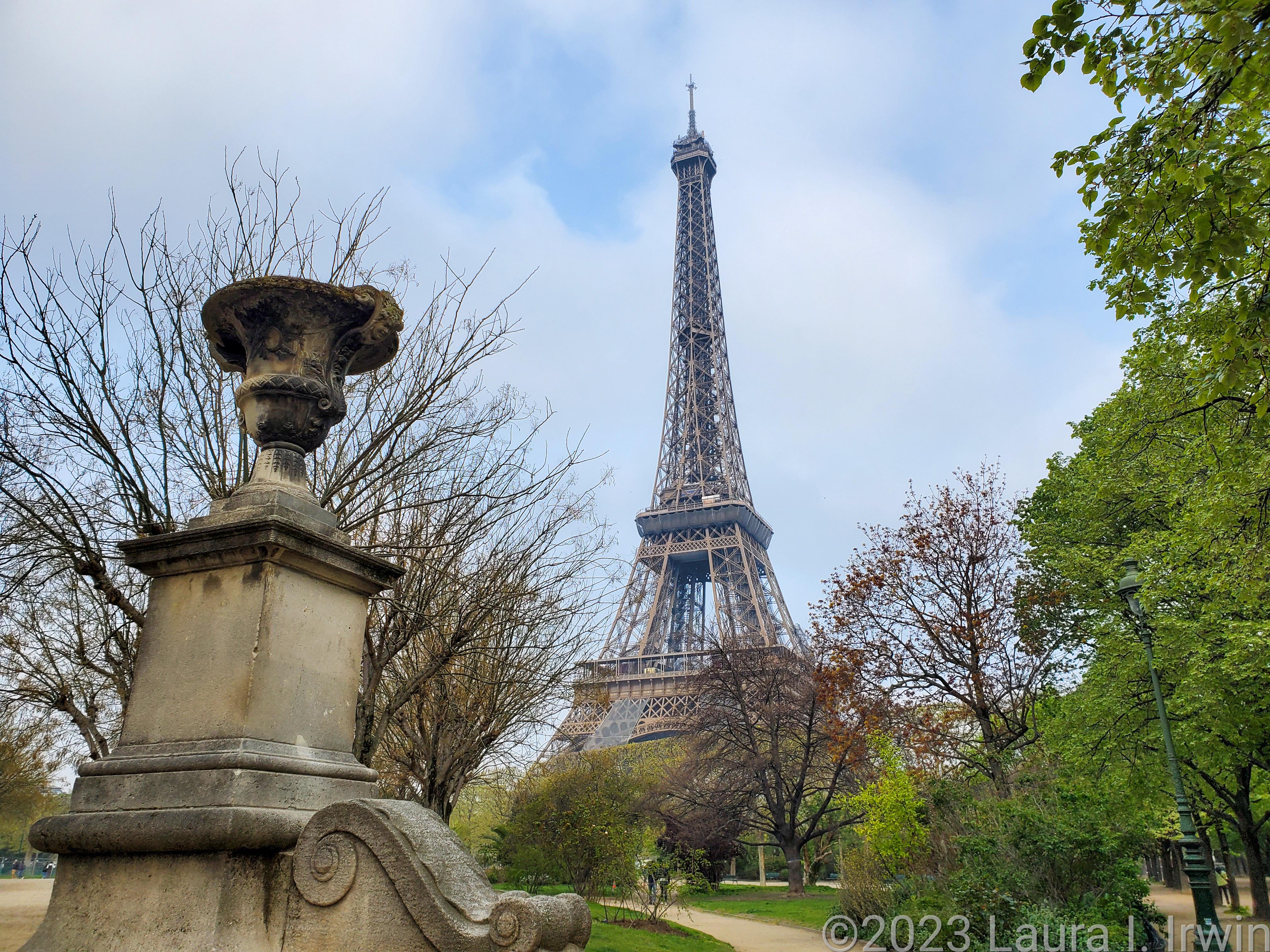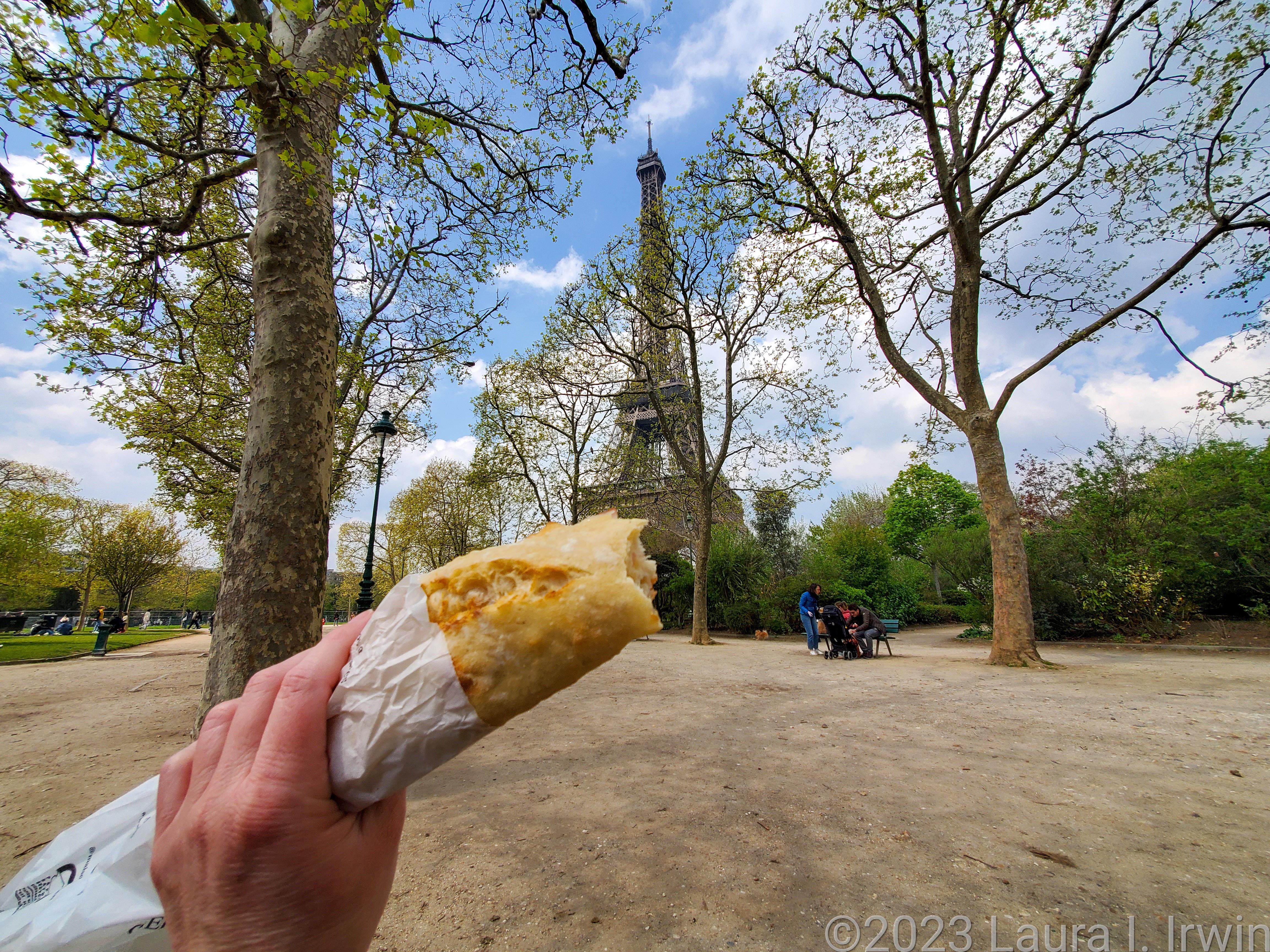 Then it was back to the Champ de Mars to find a spot to enjoy my picnic lunch. In my mind, I would sit on the grass in front of the Eiffel tower beneath cloud-dappled skies. The reality was that much of the lawn was fenced off and/or muddy and sunny skies soon gave way to clouds. That didn’t stop me from enjoying my meal on a bench not far from the base of the tower.
