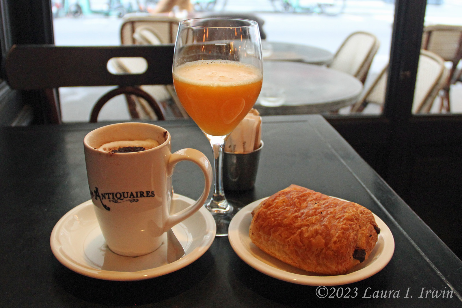 Les Antiquaires This little café turns on the charm with its dark wood tones and antiques. It was the perfect place to enjoy a pain au chocolat, hot chocolate, and orange juice while I watched the people, cars, and bicycles pass by on the street. While I certainly enjoy my breakfast pastries, I have to say that I’m getting a little tired of the same thing for breakfast every day.