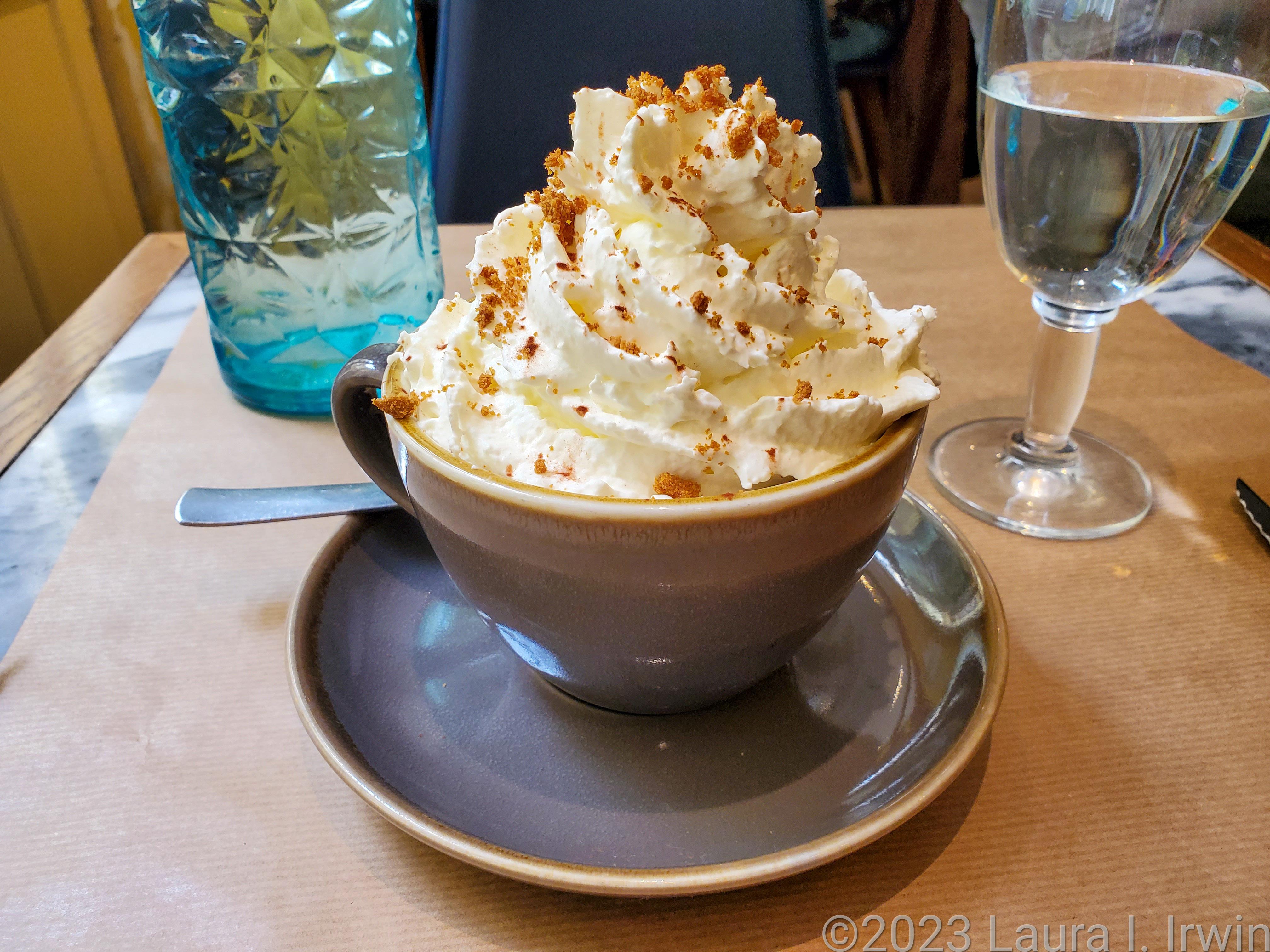 La Jacobine A small restaurant tucked away on a small passageway off Rue Saint-André des Artes, La Jacobine is well known for its hot chocolate and I had to try some, along with a tarte tatin, before leaving Paris. I recently learned that the sign of a good (European) hot chocolate is if it coats your spoon without dripping off. This one certainly did that, although it took me a while to get through the tower of whipped cream to the drink itself!