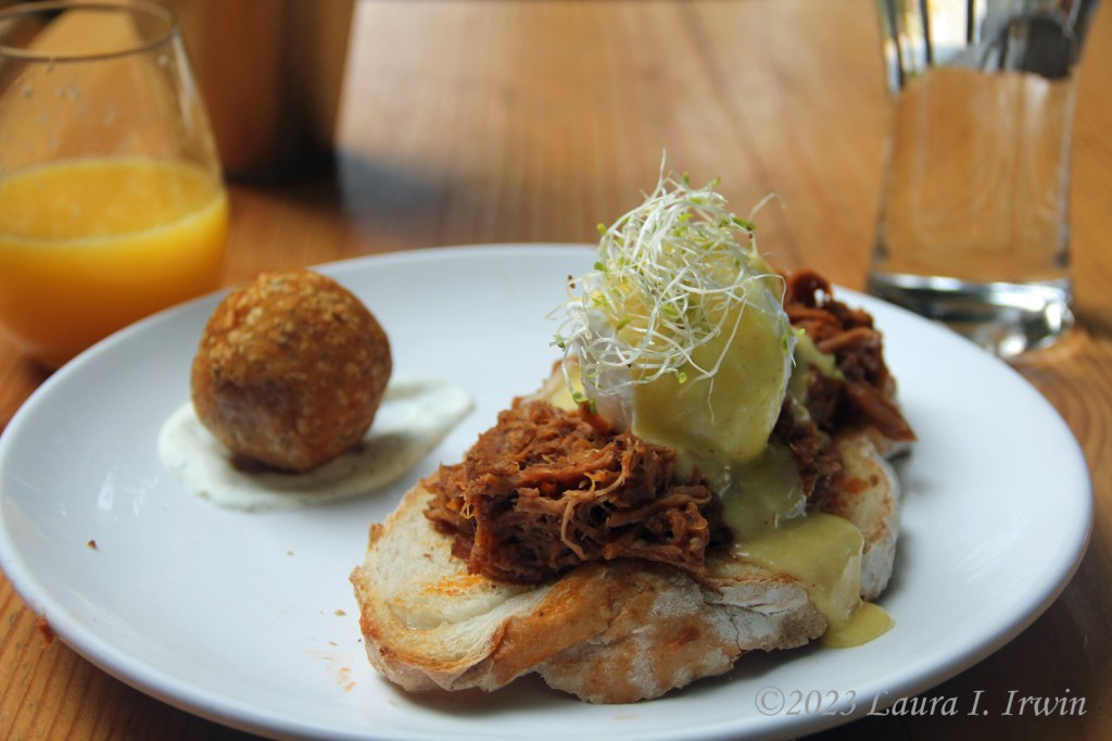Instead I took a walk around Whistler Village and went out for a late (for me) breakfast at Hunter Gather. A few of the breakfast places in the village had lines and seemed crowded but Hunter Gather is at the edge of the village and had plenty of seats. You order at the counter and they bring your food out to you. I had a seat on the patio and was able to enjoy a leisurely breakfast of pulled pork eggs Benedict with a potato croquette and a mimosa. It’s never too early to start drinking when you’re on vacation!