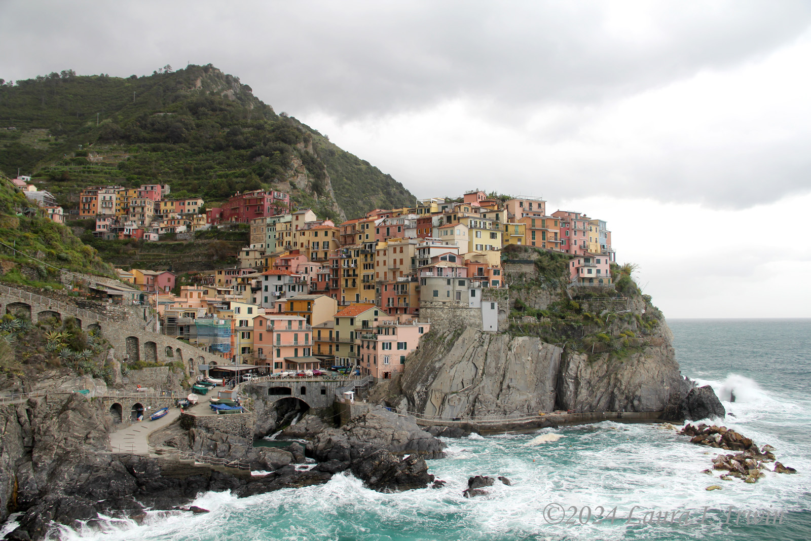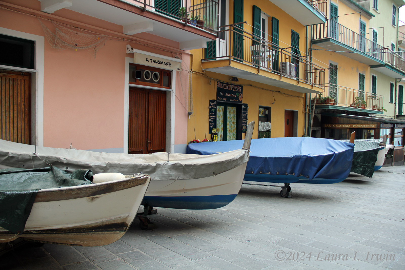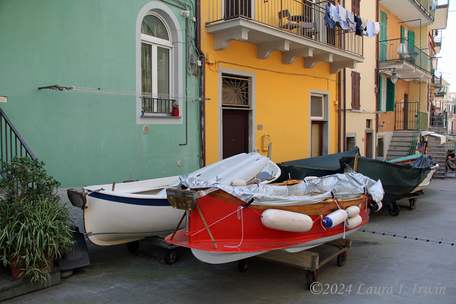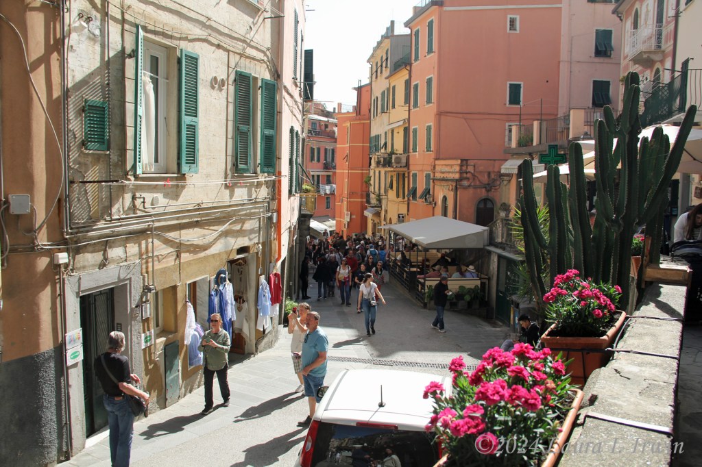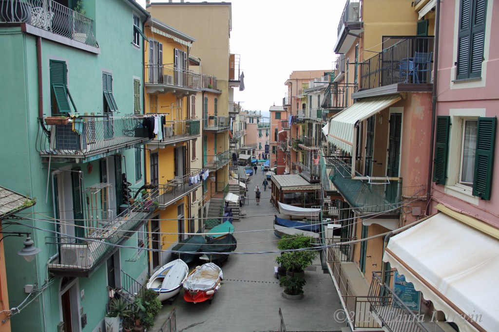 I fueled up for the day and took the 8:42 AM train to Manarola. Yesterday, I bought a 3-day Cinque Terre card which allows unlimited train rides on the Cinque Terre Express train between the villages (otherwise it’s €5 each trip) and access to the paid hiking trails. The trains come through about 3 times per hour and it is maybe 3 to 4 minutes from one village to the next. Once I got to Manarola, I just started wandering around town. I ended up going down Via Birolli to the harbor. Along the road, boats are pulled up just like cars in front of homes and businesses.