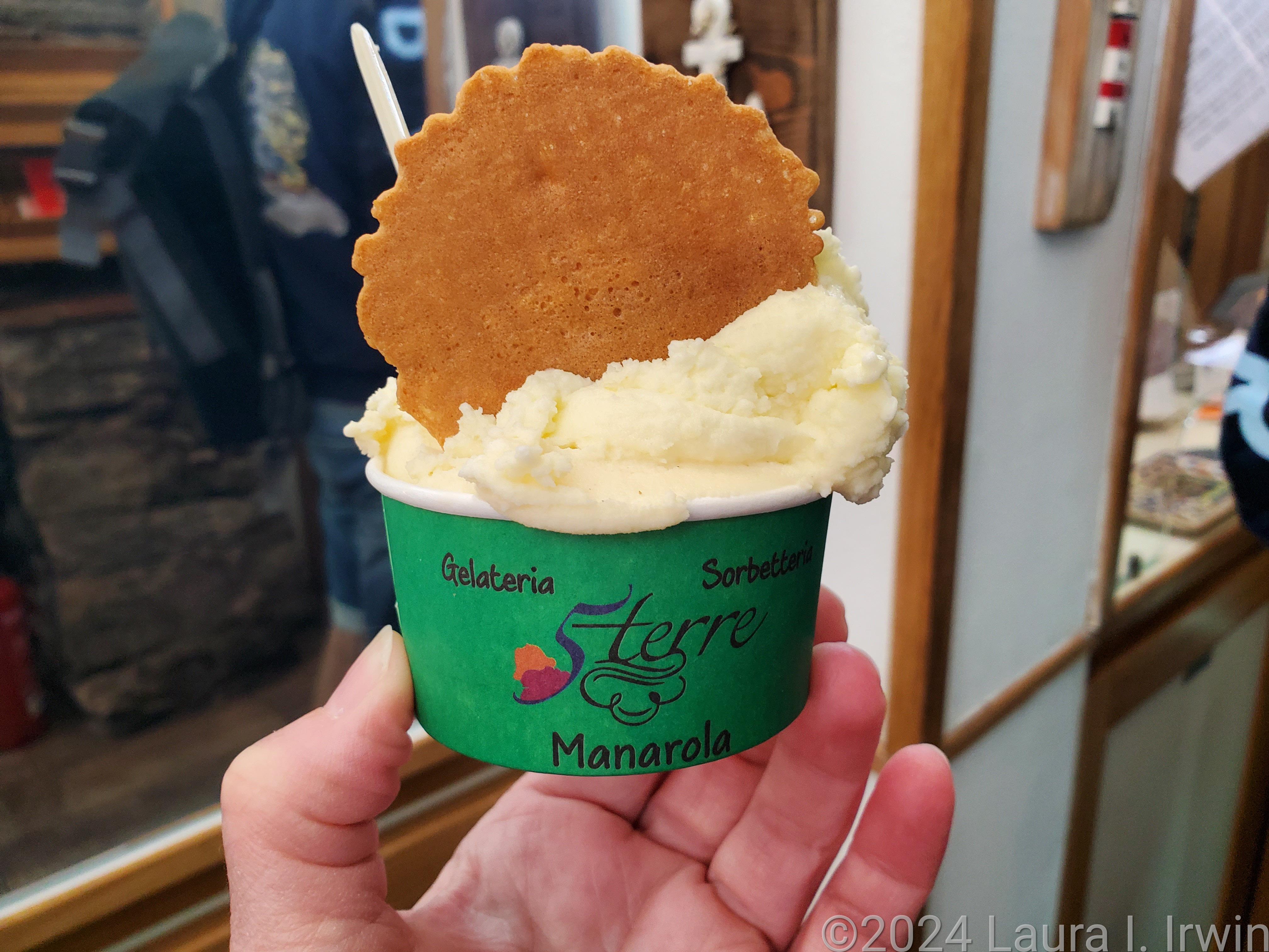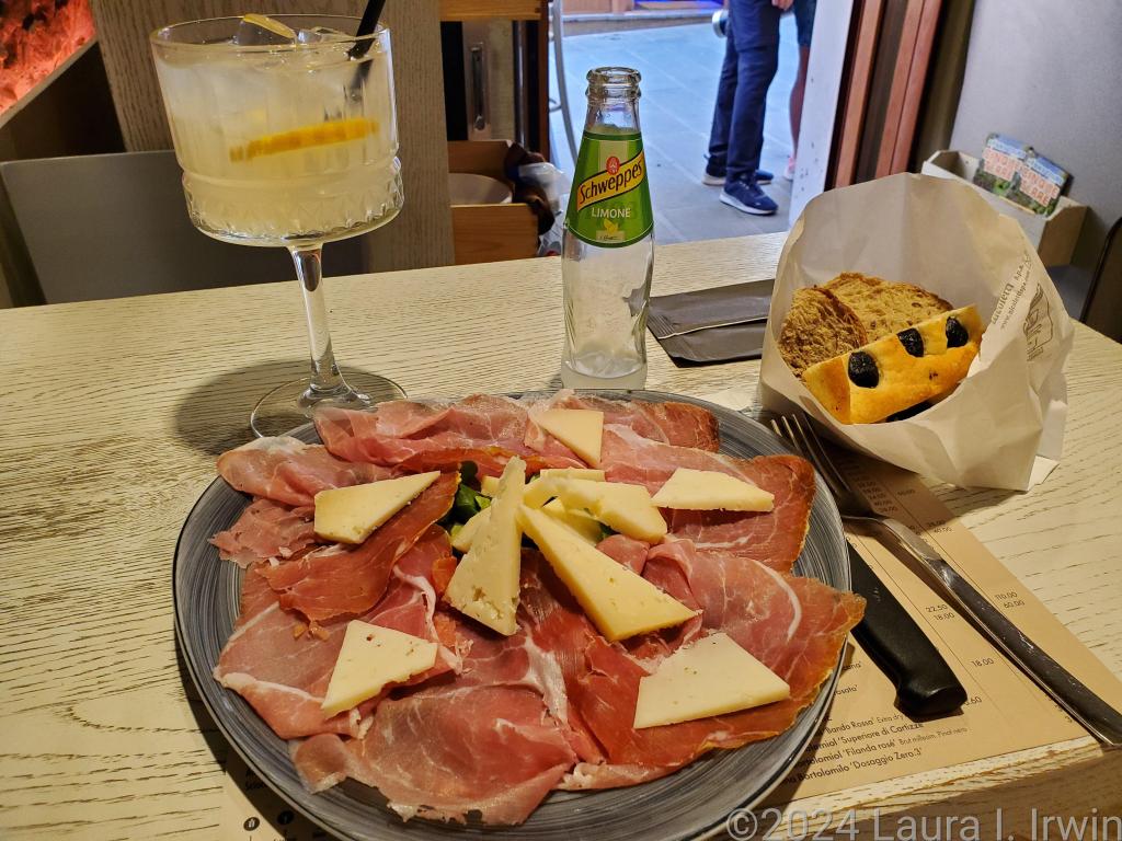 Since the next shuttle bus down to Manarola didn’t leave until 12:20 and it was only 11:45, I decided my legs could use more of a workout and I walked back to Manarola. The walk involves 1400 steps, but at least I was going downhill. By then, the sun had come out, and I wandered around some of the shops snd then started looking for food. I ended up at Il Porticciolo where I enjoyed a charcuterie platter of Parma ham and pecorino cheese, a basket of bread, and a cocktail with peach vodka and lemon soda. I capped my visit to Manarola off with a gelato from Gelateria 5 Terre and another walk out to Punto Bonfiglio. It’s safe to say I fell in love with Manarola today.