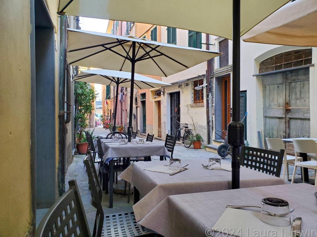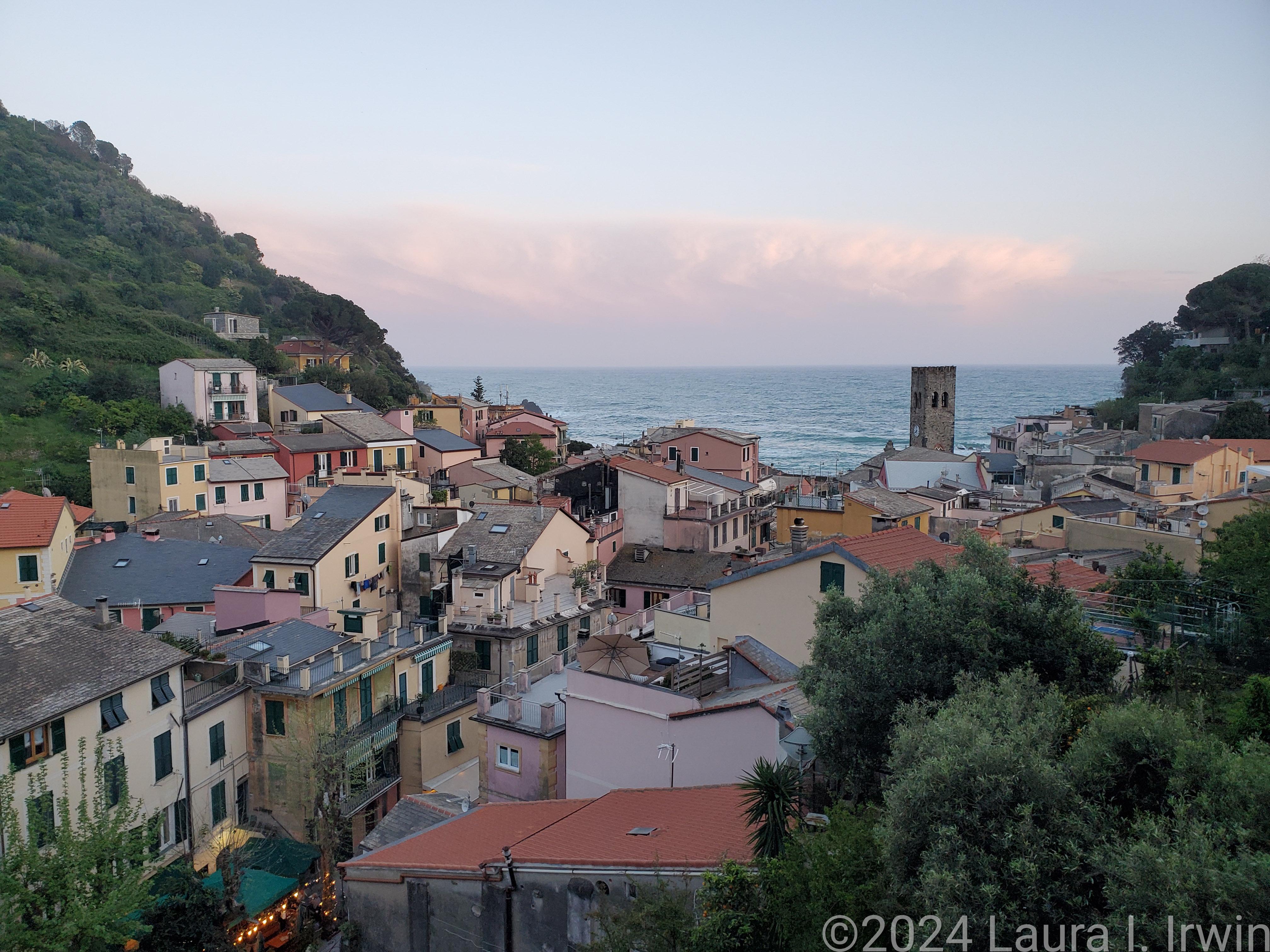 I decided I wanted a nice dinner tonight, so I went to Ristorante Via Venti and ate at an outdoor table along the tiny, hidden alley just one road back from the main road, but a world away. While I was waiting for my food, I watched a woman hanging her laundry out to dry on the third floor across the street. I had a delicious pasta stuffed with pear and cheese with a glass of prosecco and finished it off with a delicate lemon cake with a glass of sciacchetrà, a local sweet wine. I made it back to my room to enjoy the sunset colors and then spent the rest of the night with my balcony door open, listening to the sounds of conversation floating up from the enoteca down on the street below.