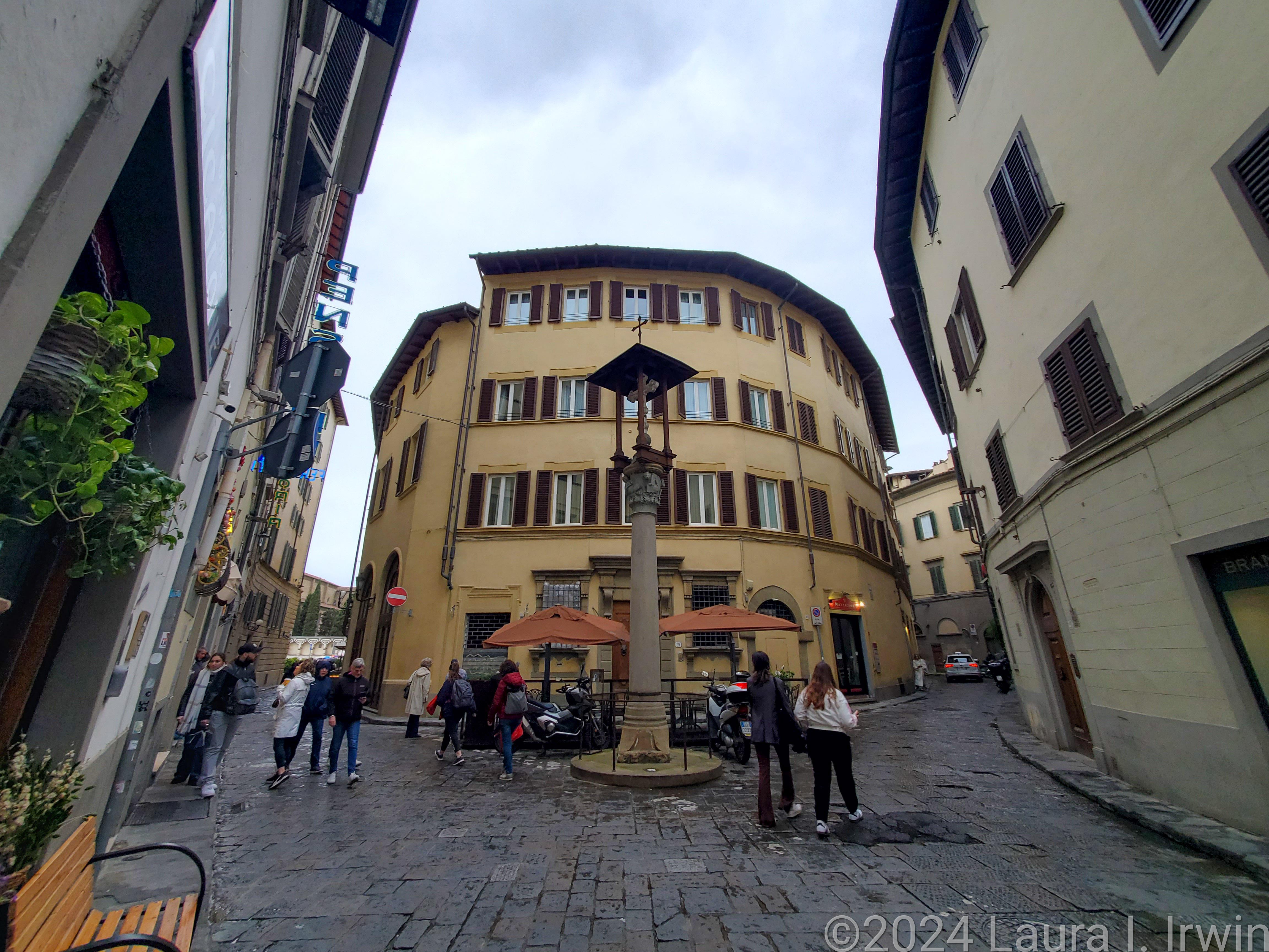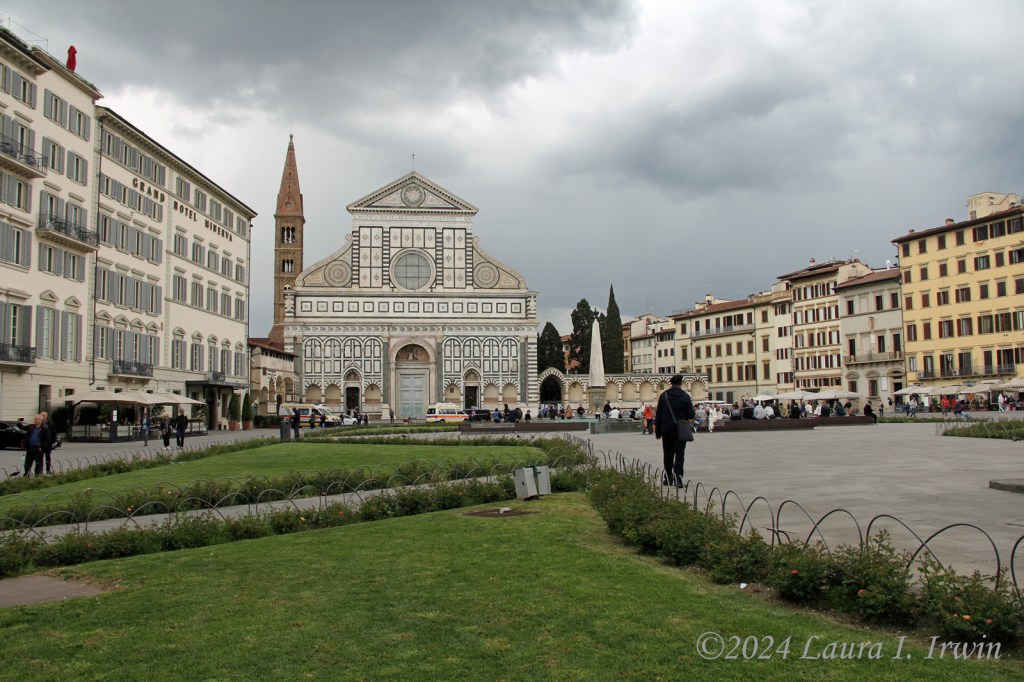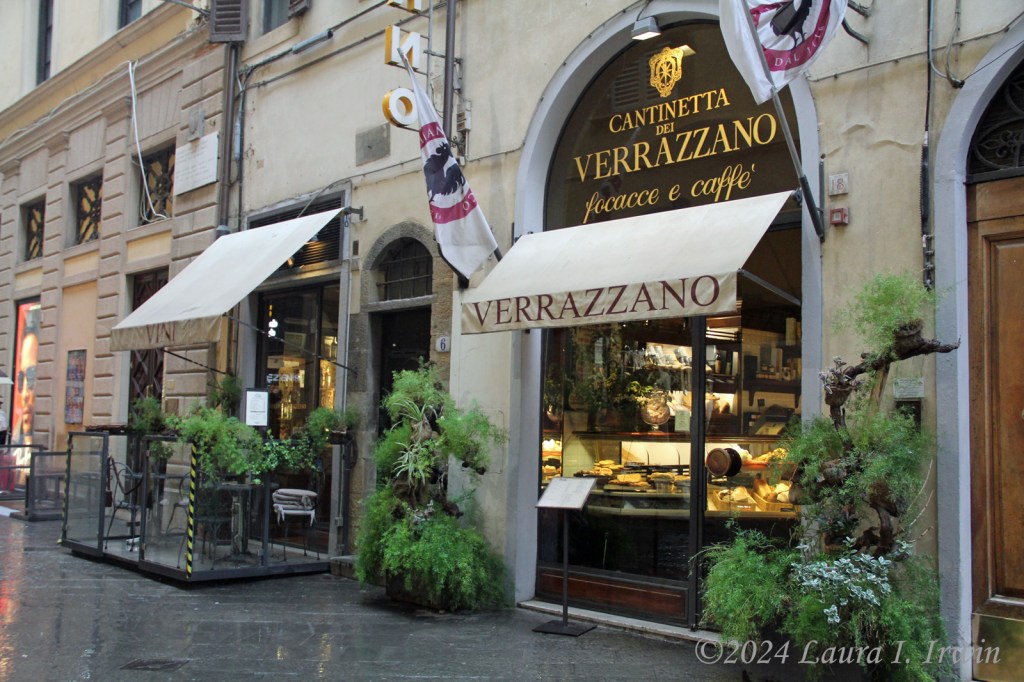 I quickly dropped off my things and headed out to explore Florence. First up was a stop at Santa Maria Novella church, for which one has to pay €7.50 for entrance. I admired it from the outside and kept going. Before I left this morning, Matteo had recommended a favorite restaurant in Florence for lunch, Cantinetta dei Verrazzano. I had to wait a while for a table, but that turned out to be a good thing as the heavens opened and it started pouring and thundering. My lunch consisted of prosciutto, greens, and cream cheese on focaccia and a glass of prosecco, enough to keep me going for the afternoon but nothing to write home about.