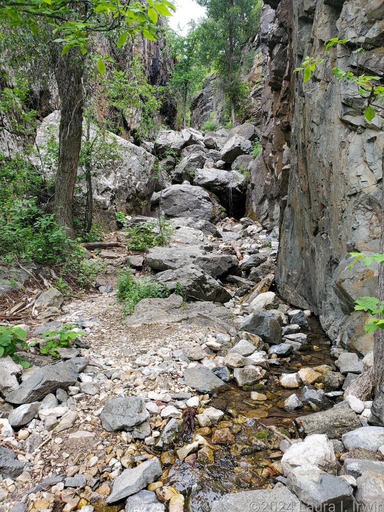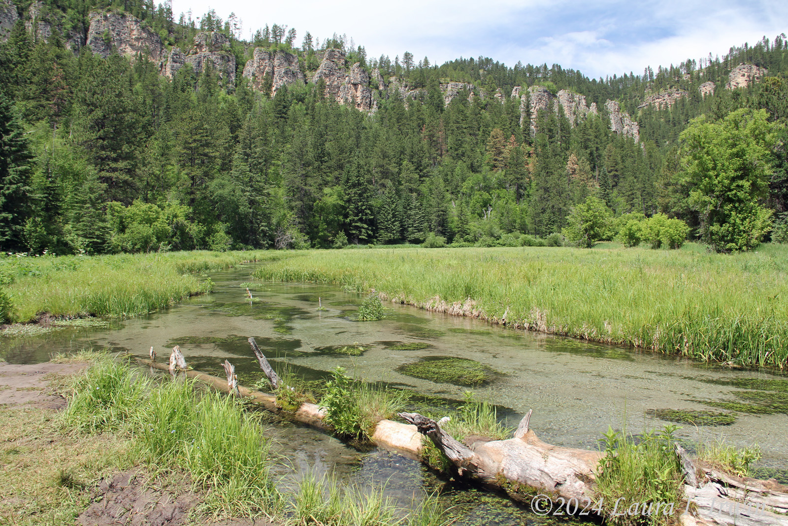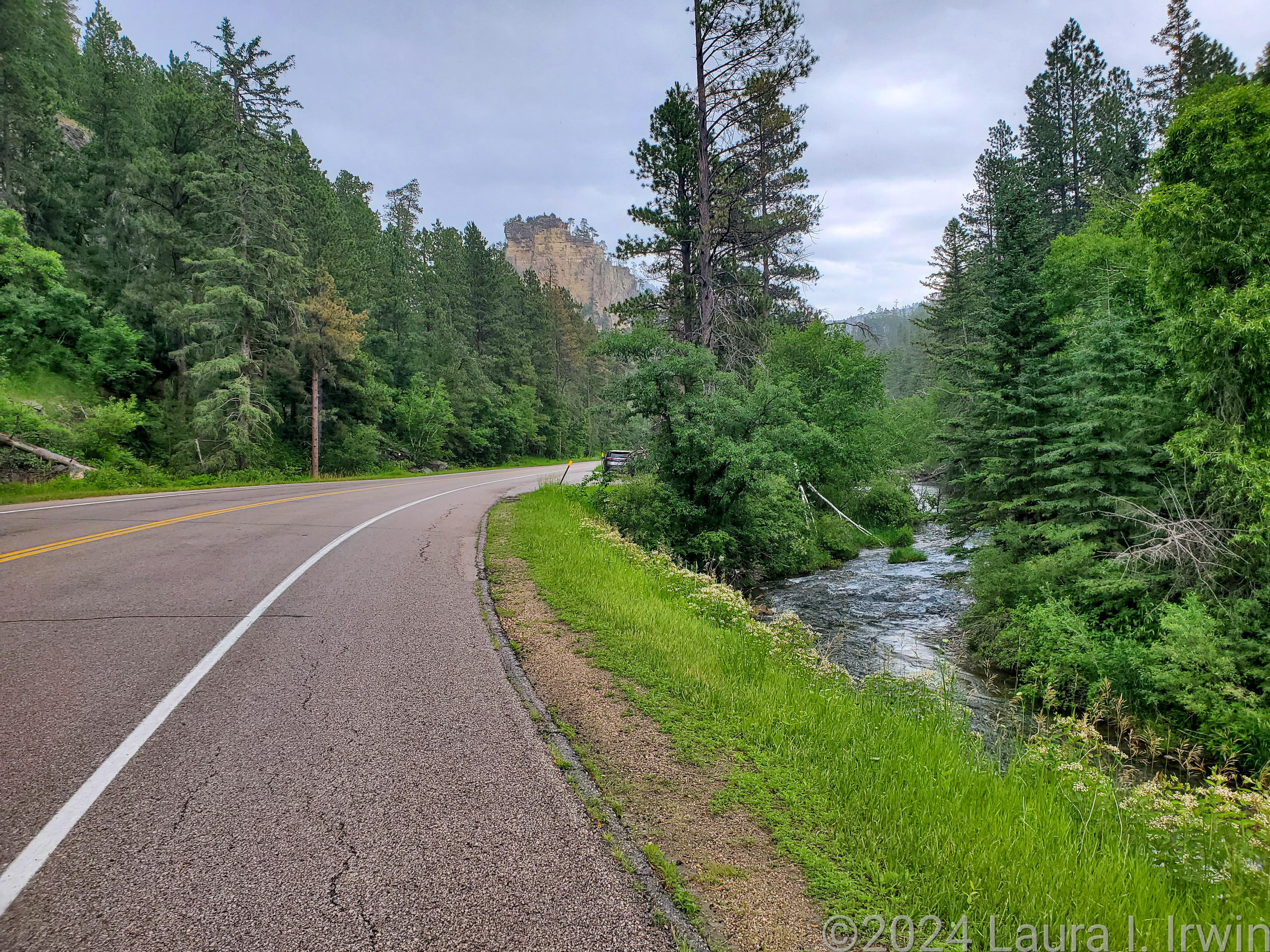 Despite having to dodge some raindrops today, I mainly stuck to my original plan of driving the Spearfish Canyon Scenic Byway, which winds for 20 miles through Spearfish Canyon from Spearfish south to Cheyenne Crossing. The road follows Spearfish Creek through the canyon and makes several waterfalls easily accessible.