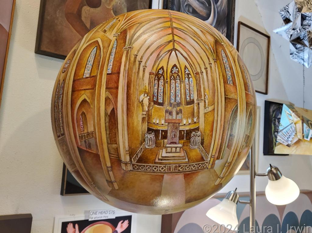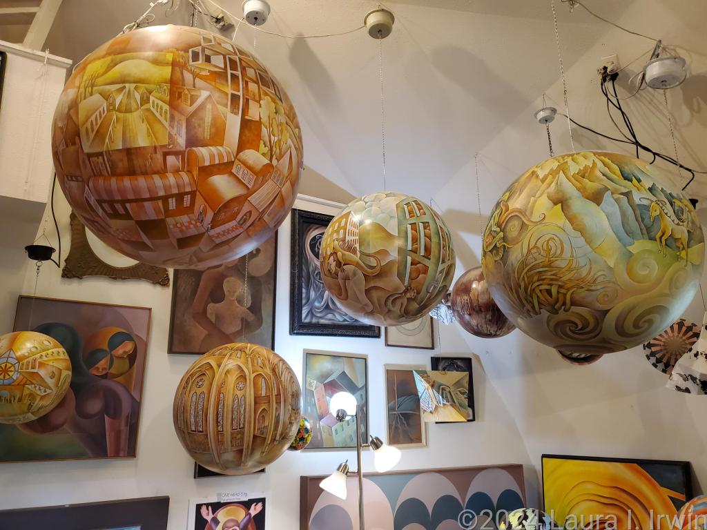 After sufficiently tiring my legs for the day, it was back to Spearfish to visit a unique gallery: the Termesphere Gallery. Dick Termes paints 6-point spheres depicting various scenes and abstracts in “inside-out views” which then rotate on electric motors. The idea is that you are standing in one place, getting a 360-degree view of everything around you. The gallery has spheres hanging from the ceilings as well as two-dimensional depictions of some of the scenes. I wasn’t sure what to expect, but I was impressed!