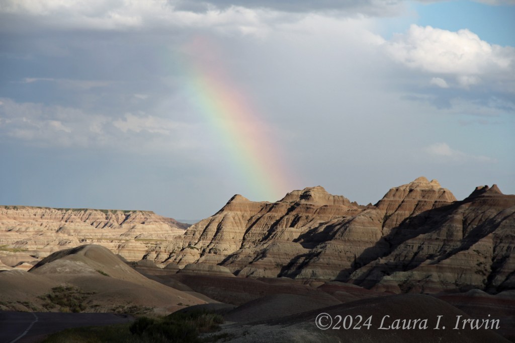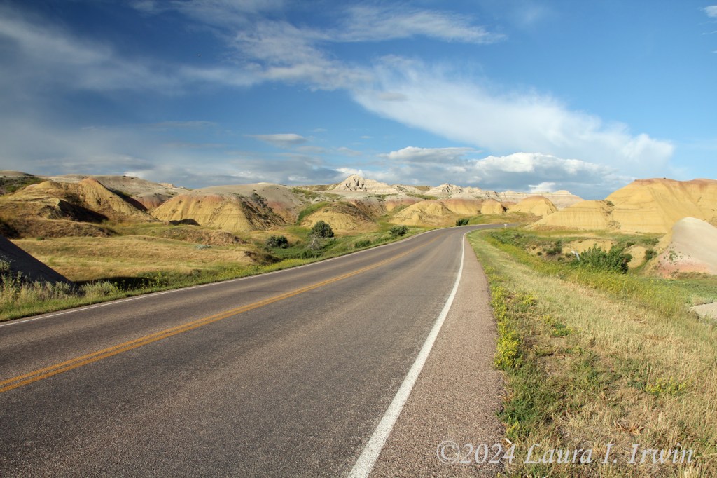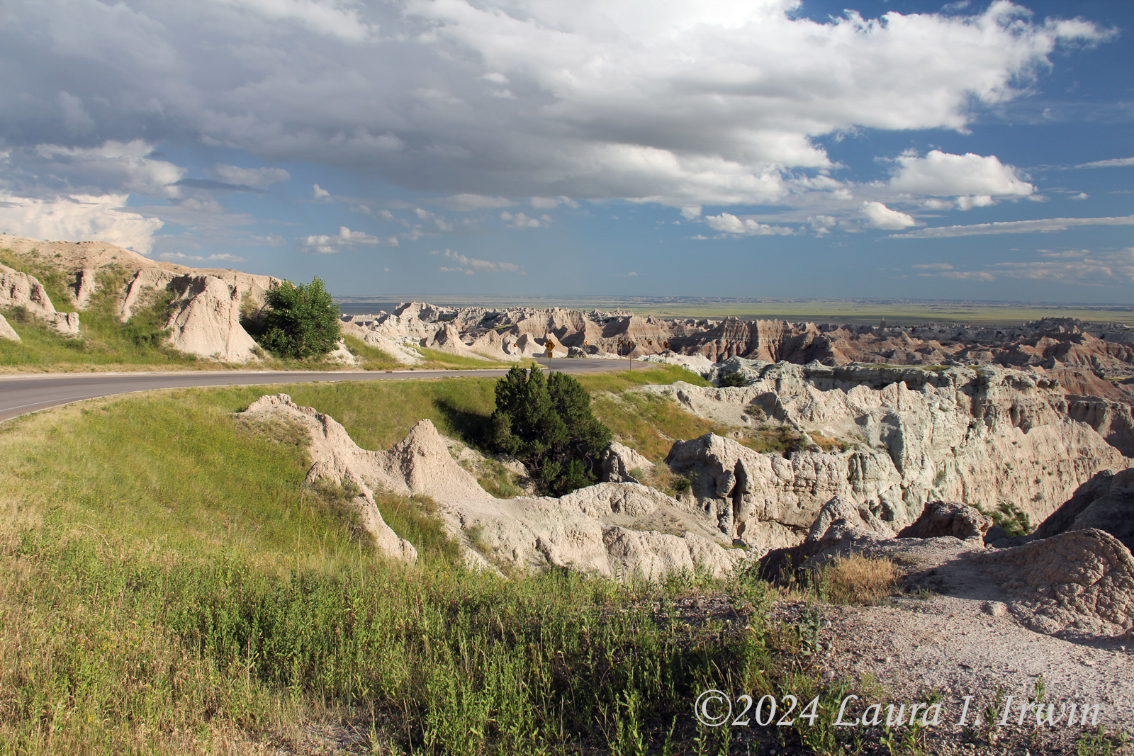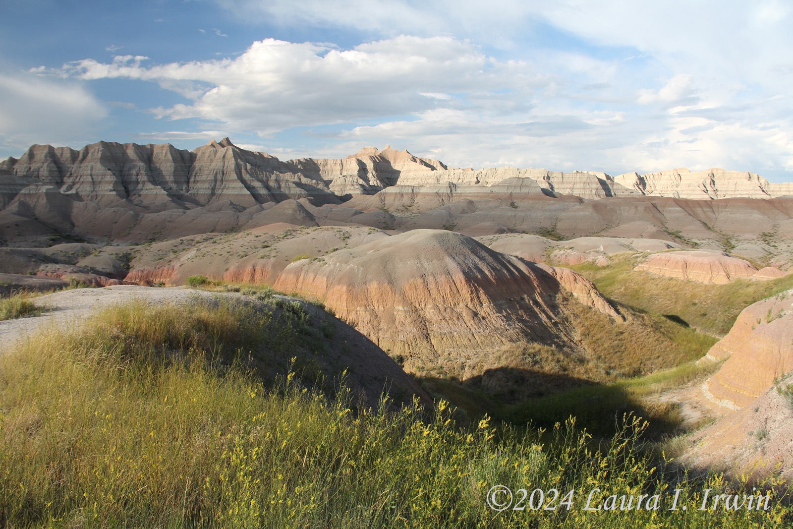 I wanted to take in the night sky program at Badlands National Park tonight, but I’m also tired and can’t stay up late tonight and also get up early tomorrow. So I opted for a short trip into the park after dinner. I immediately fell in love with this park. It reminds me a little of Bryce Canyon in that it has lots of interesting pinnacles, buttes, and mounds jutting out of the earth. The layers of sediment can be seen on the rock and are quite colorful. I stopped several times to take pictures and just admire the beauty. I’m looking forward to seeing more of the park tomorrow, but for now, it’s time to call it a night.