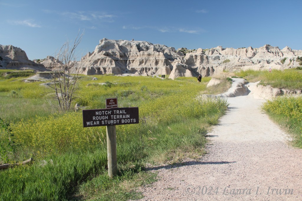 Notch Trail The Notch trail ends at a notch in the rocks and overlooks the prairies surrounding the badlands. The trail is pretty flat at first, and then… bam! A log ladder to scale in order to continue on. The ladder leads to a narrow ridge which eventually opens up to continue to the notch.