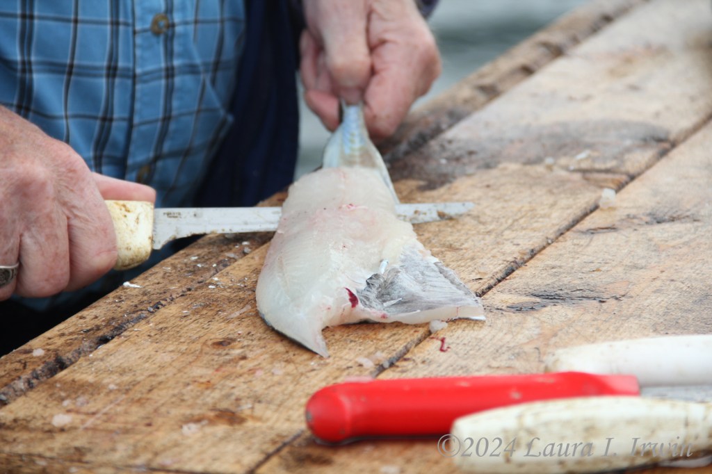 On the way back to the main road, I decided to stop at the harbor to take some pictures of the boats. I parked the car and was heading down the road to the harbor when I saw dozens of seagulls circling around one of the docks. And there were two fishermen fileting the morning’s catch of fresh cod. I walked over and struck up conversation for a few minutes. I will say it again: Newfoundlanders are the nicest, friendliest, and kindest people you can possibly meet. Neither one minded as I asked questions and took pictures (with their permission).