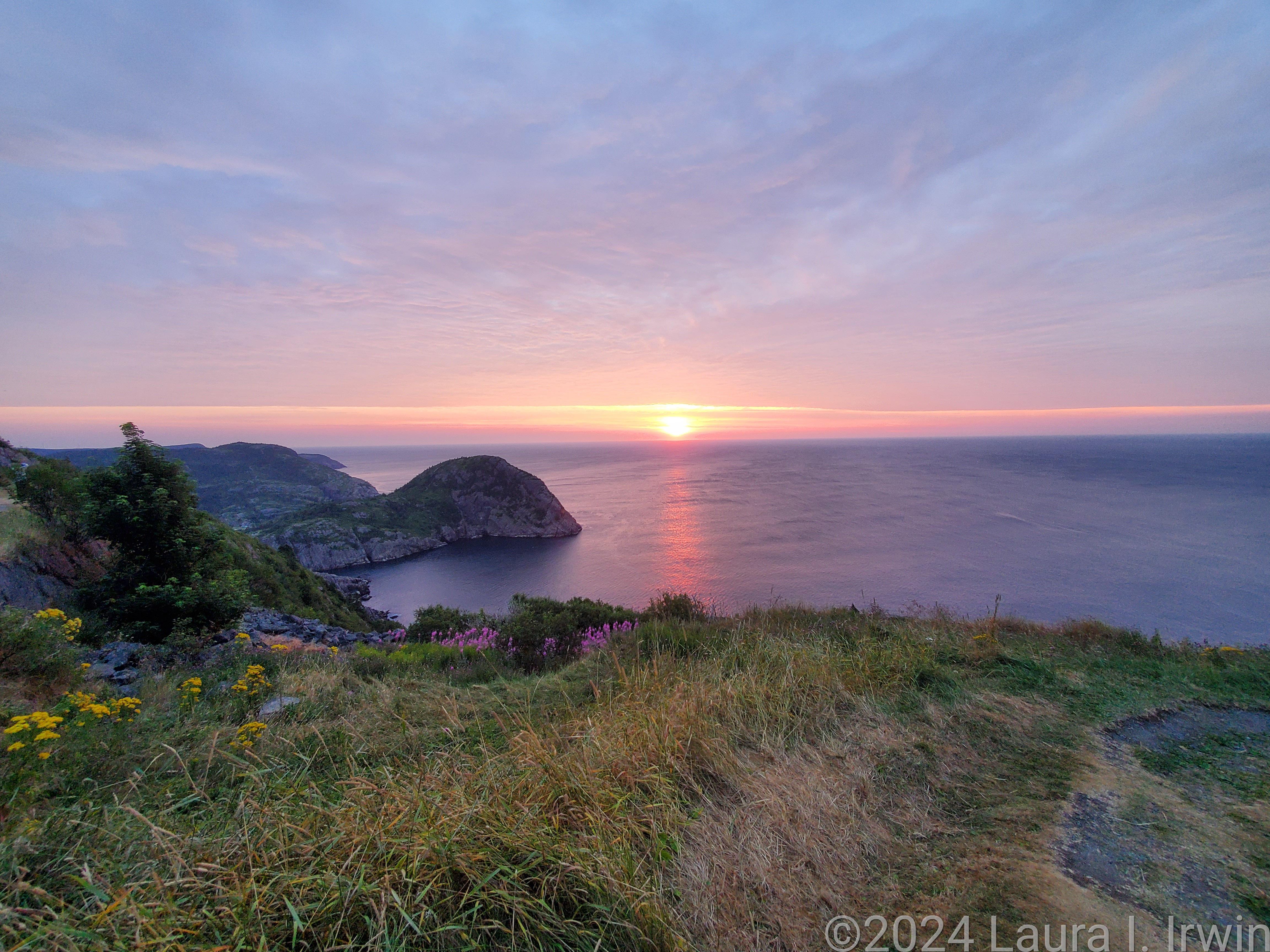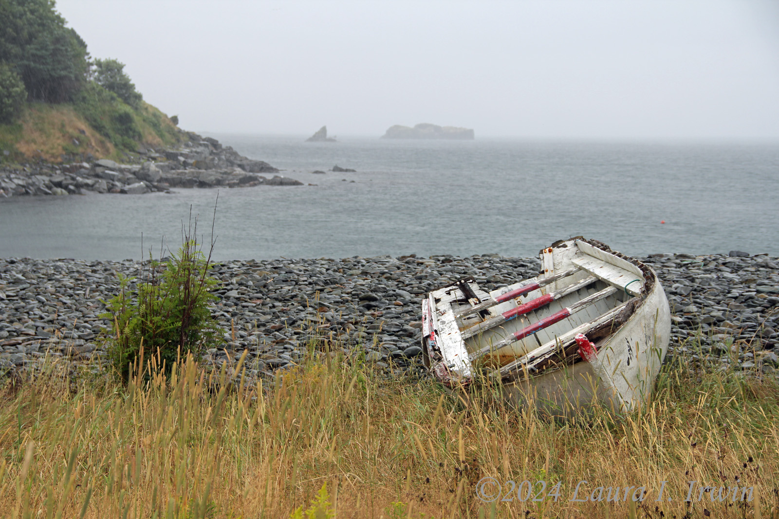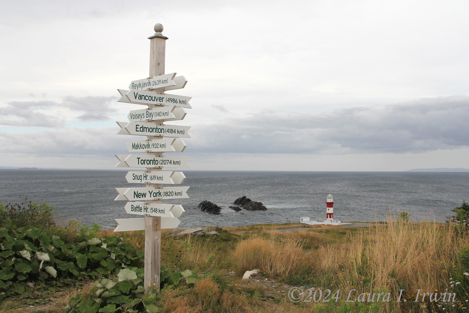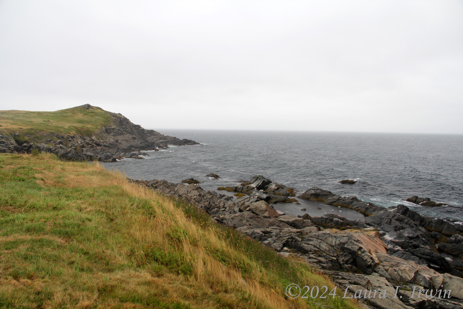 The rest of my day was spent driving part of the Baccalieu Coastal Drive on the northern part of the Avalon Peninsula. My destination was the Small Point/Broad Cove area, where my stepmother’s family hails from. The weather turned overcast and rainy by mid-morning so I only made a few stops along the way. There are a number of small peninsulas to explore, not unlike the coast of Maine or the coast of Ireland. I chose one that looked appealing on the map and headed toward Port de Grave and the Green Point Lighthouse. The road was winding and provided plenty of views of the coast along the way. I thought maybe I was in the wrong place following the signs to the lighthouse, as the road turned to gravel, then climbed up a hill that looked like it would drop right off into the ocean. It did not, and soon I was at the end of the road looking down at the red and white striped lighthouse.