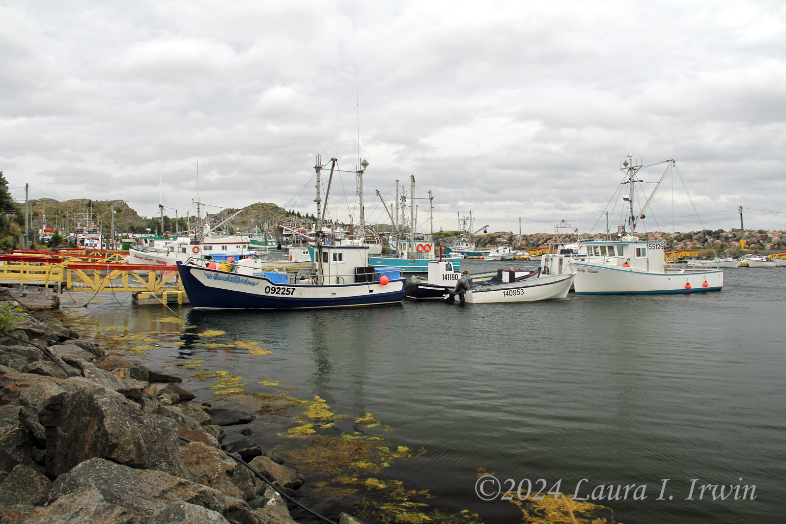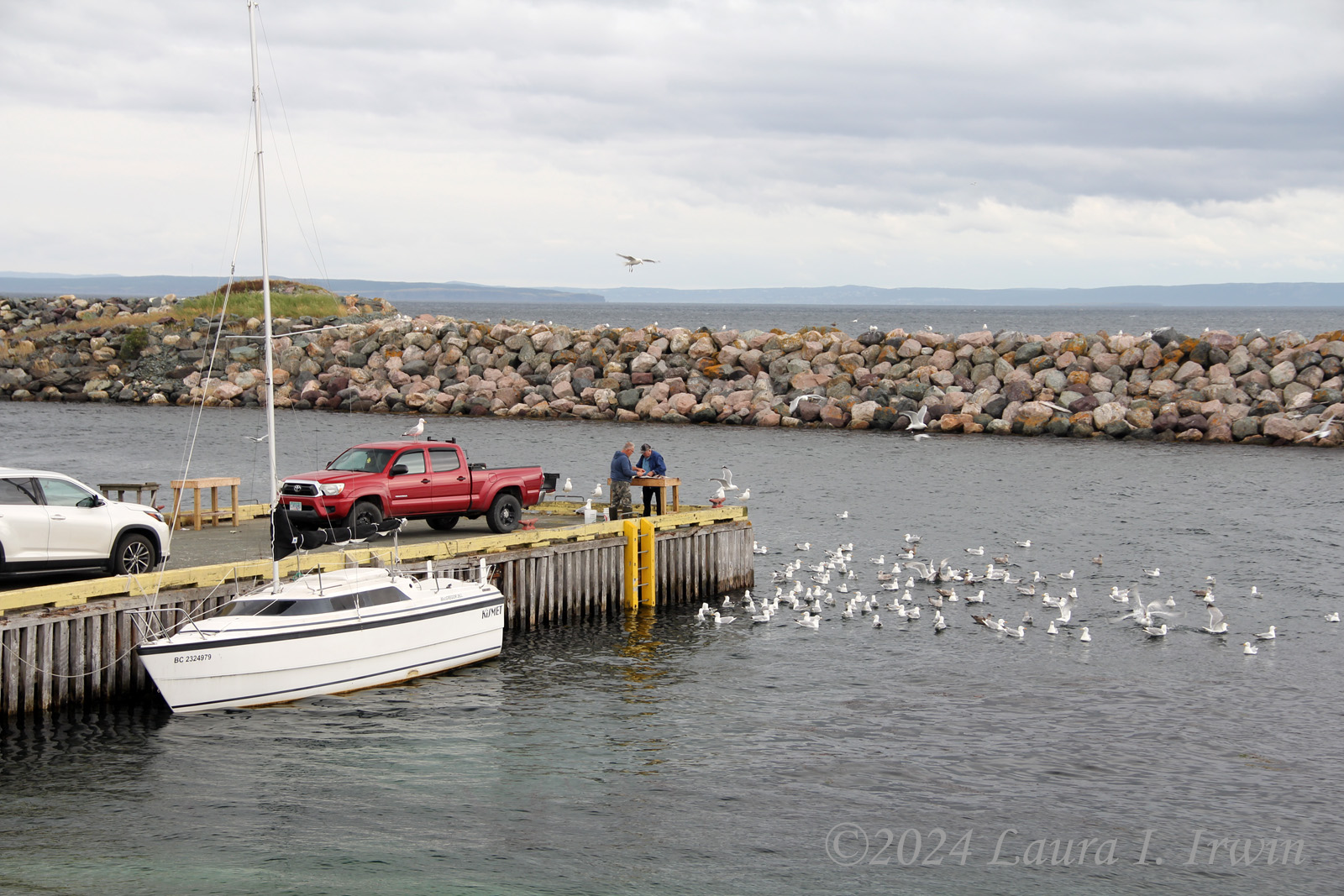 On the way back to the main road, I decided to stop at the harbor to take some pictures of the boats. I parked the car and was heading down the road to the harbor when I saw dozens of seagulls circling around one of the docks. And there were two fishermen fileting the morning’s catch of fresh cod. I walked over and struck up conversation for a few minutes. I will say it again: Newfoundlanders are the nicest, friendliest, and kindest people you can possibly meet. Neither one minded as I asked questions and took pictures (with their permission).