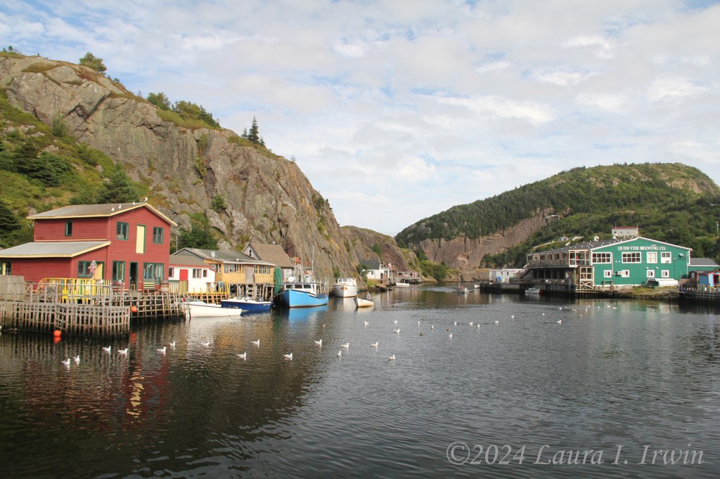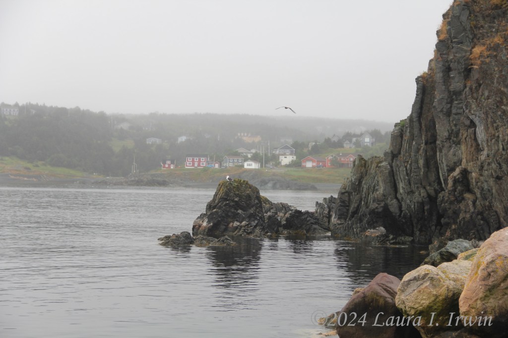 After a boring breakfast of French toast with partridge berries (tiny and similar to cranberries but not quite as tart), I set off to drive part of the Killick Coast Drive, a 55 km (34 mi.) loop on the southern side of Conception Bay. The weather was still dreary this morning and there was a lot of fog along the coast. I made several stops to take pictures of the coastline along the drive. In Pouch Cove, I stepped out of the car and there was a swarm of seagulls overhead. It didn’t take me long to figure out that a man was unloading fish into the water and the gulls wanted a snack!