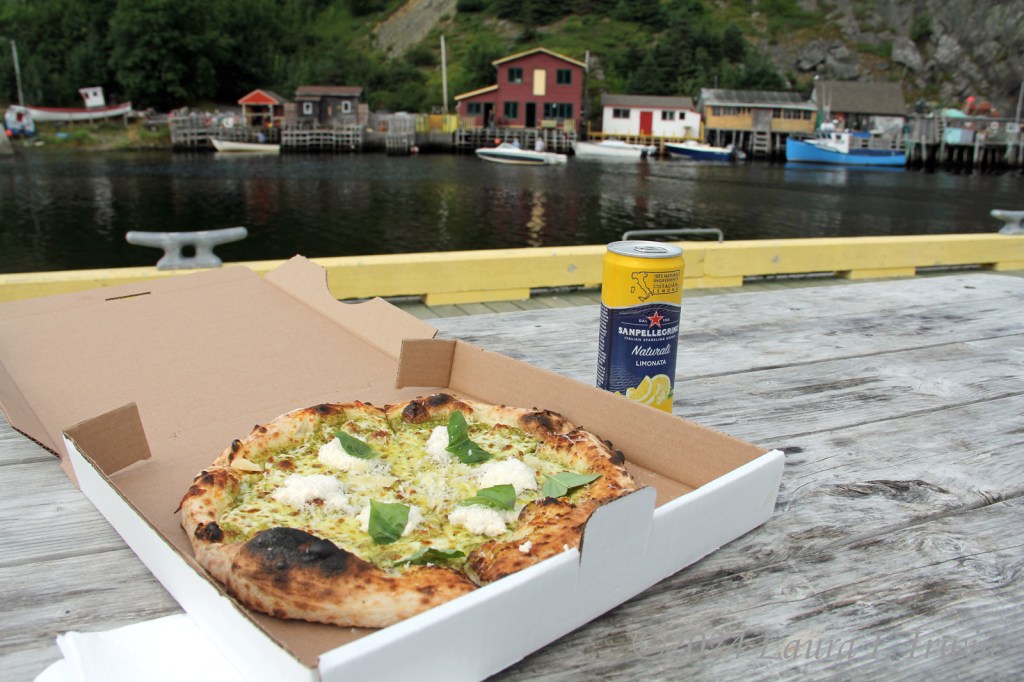 Though the sky was clearing by mid-afternoon, I took a couple of hours to be lazy and repack my suitcase before heading out again. In Quidi Vidi, there is an area called “The Wharf” with several permanent food trucks set up with picnic tables by the harbor. My original plan was foiled when the fish and chips truck was no longer there, but I ended up with an amazing lemon ricotta pesto pizza (Neapolitan style) and lemon San Pellegrino from Crosta Alta. And the setting couldn’t be beat!