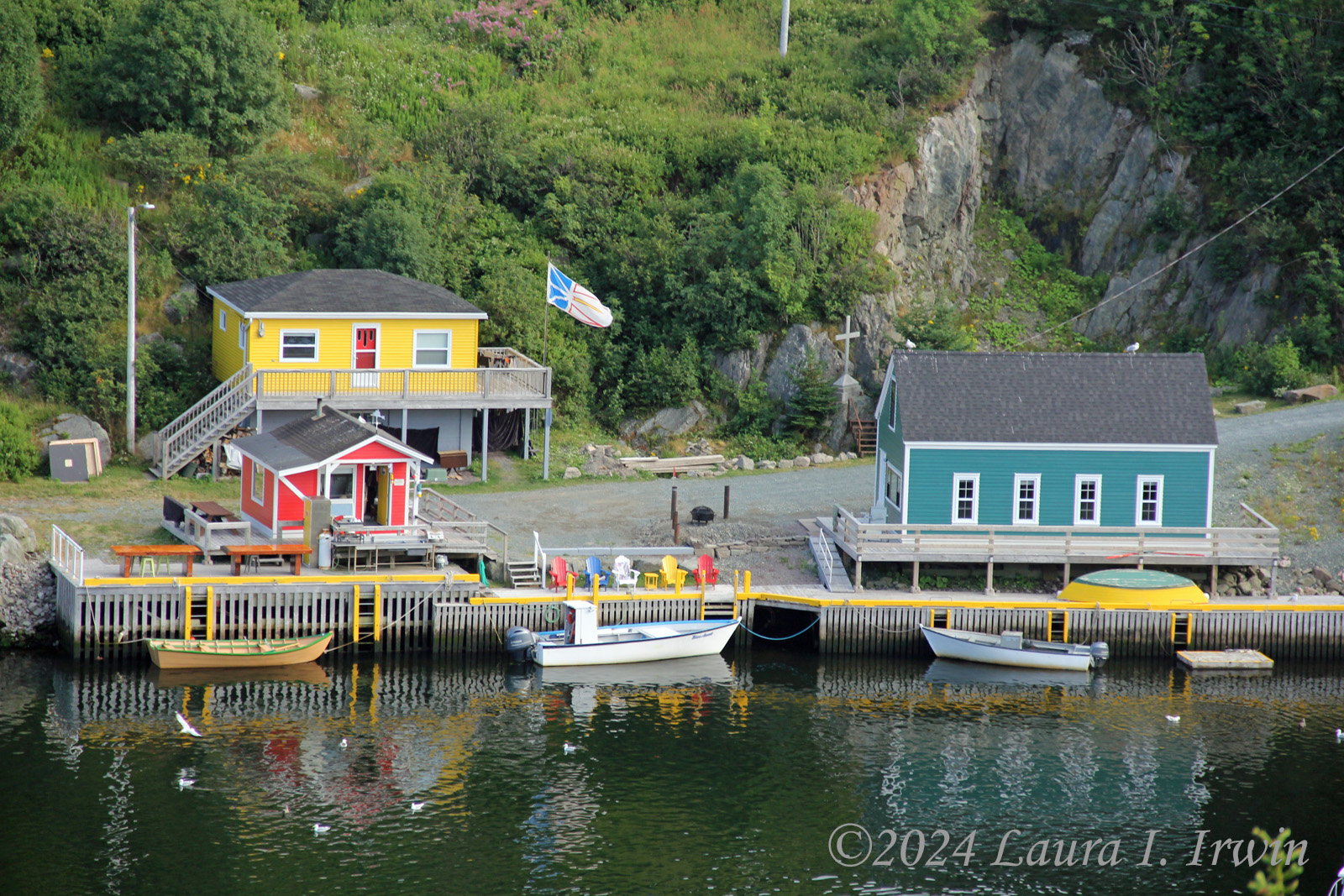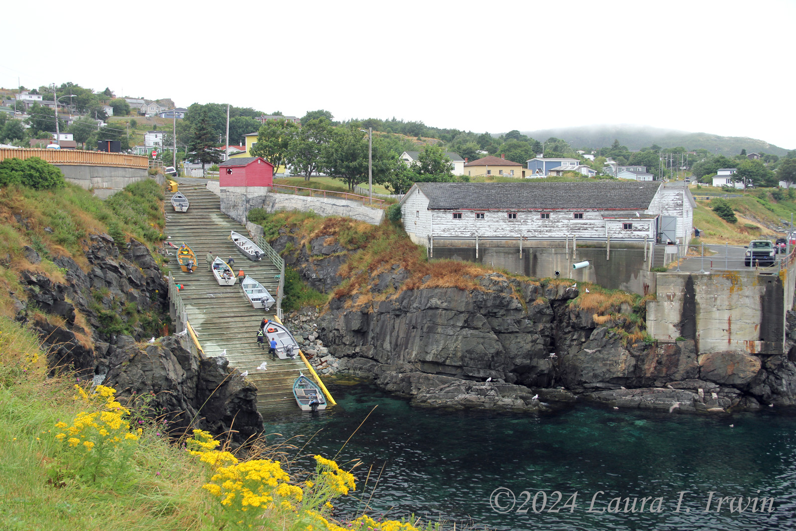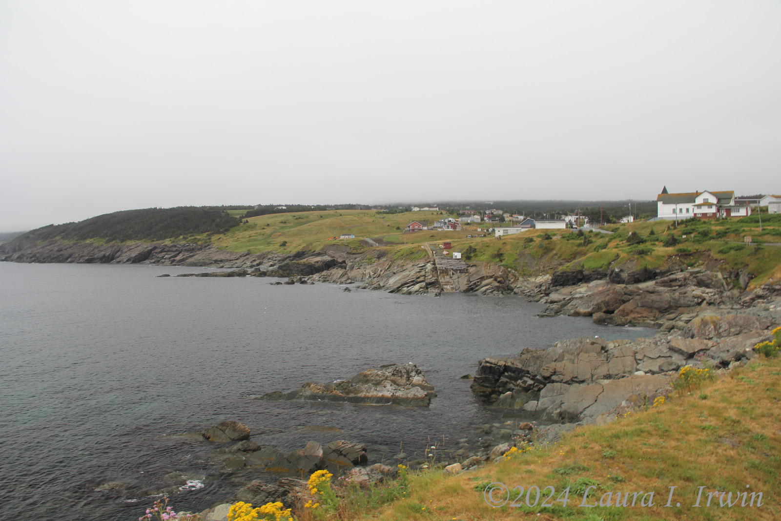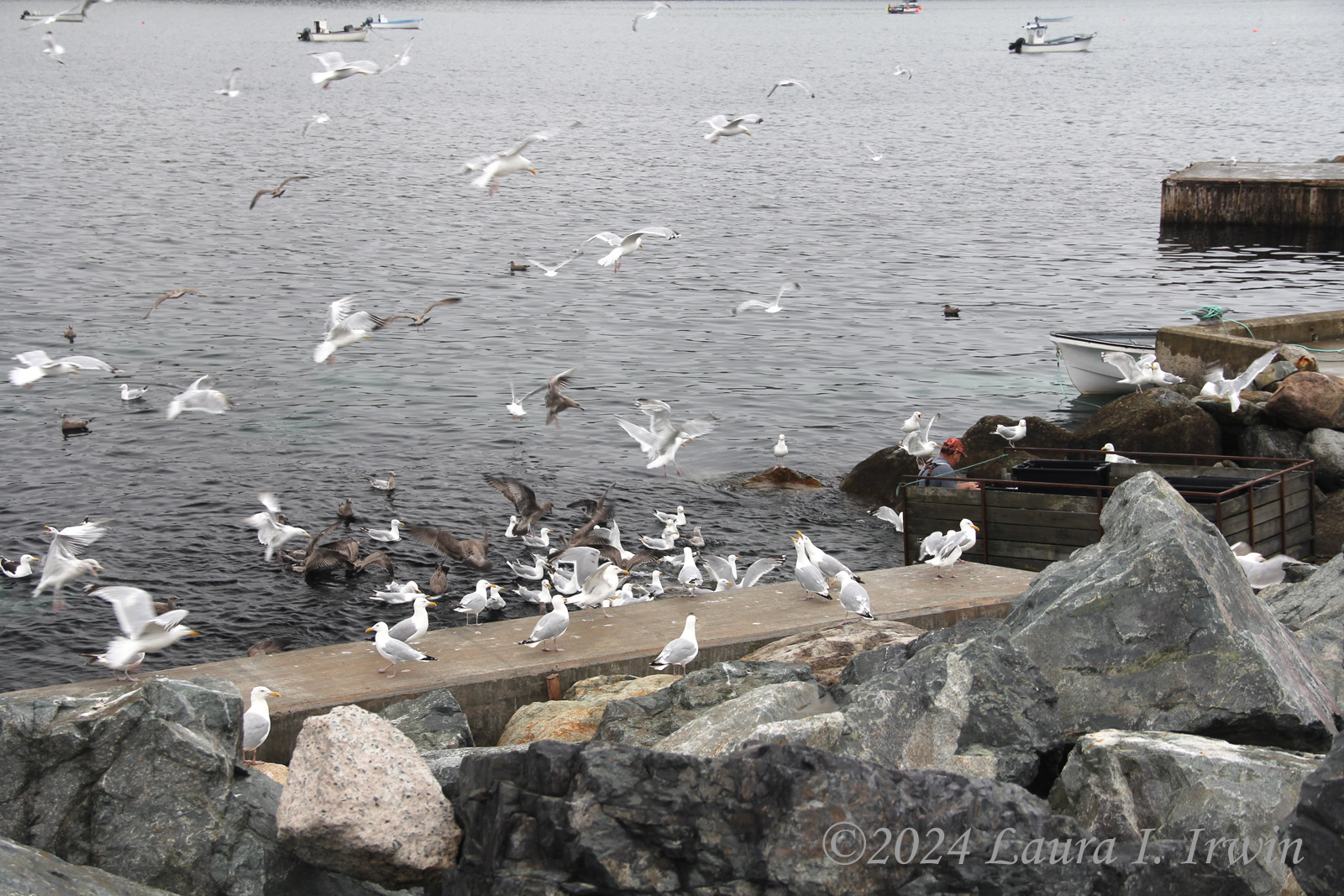 After a boring breakfast of French toast with partridge berries (tiny and similar to cranberries but not quite as tart), I set off to drive part of the Killick Coast Drive, a 55 km (34 mi.) loop on the southern side of Conception Bay. The weather was still dreary this morning and there was a lot of fog along the coast. I made several stops to take pictures of the coastline along the drive. In Pouch Cove, I stepped out of the car and there was a swarm of seagulls overhead. It didn’t take me long to figure out that a man was unloading fish into the water and the gulls wanted a snack!