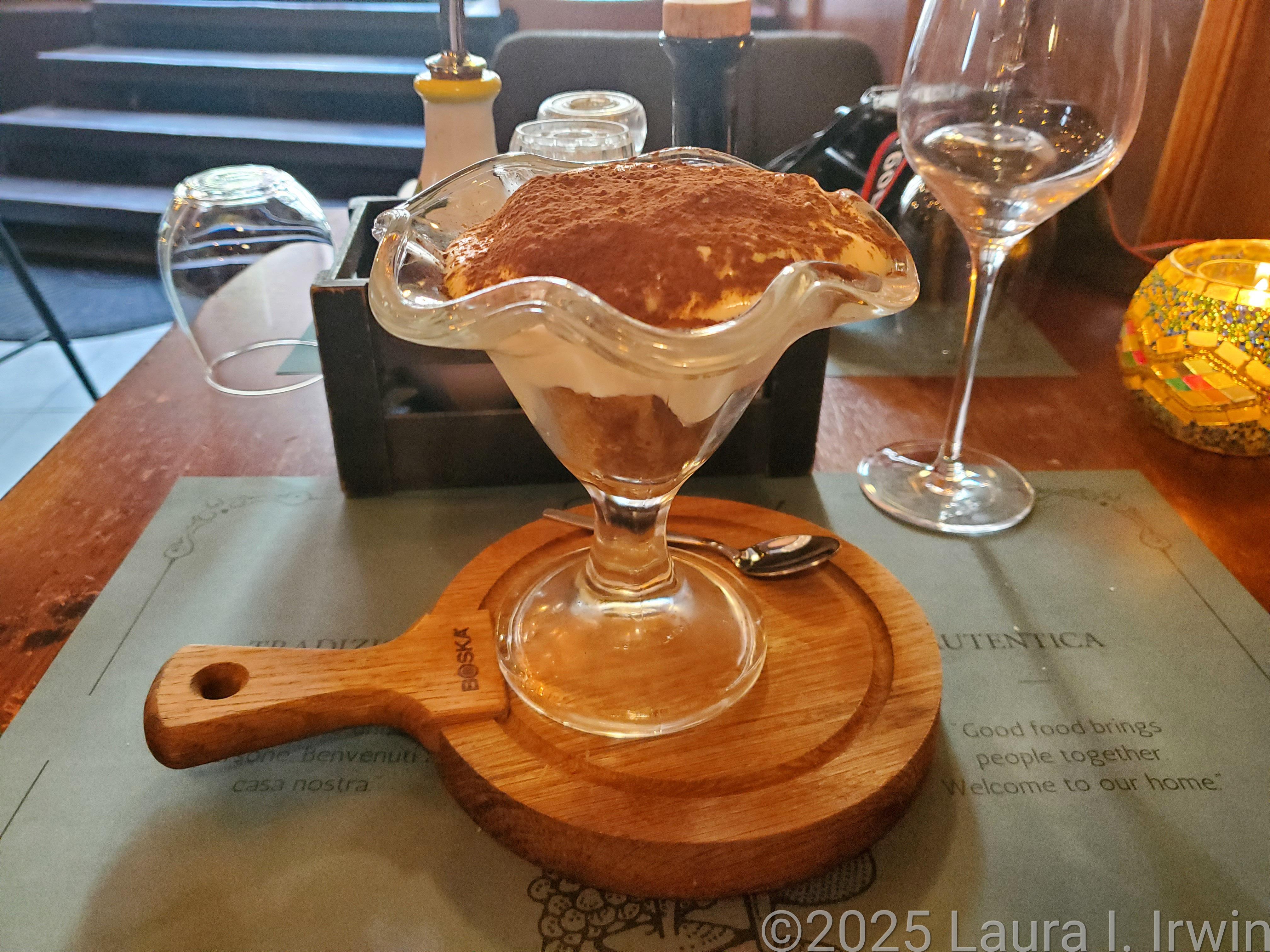 Dinner was at Il Pacioccone, only a couple of minutes from my hotel. I feasted on soft, dense Italian bread, gnocchi in a gorgonzola sauce with pears and walnuts, and a glass of prosecco. I topped off the meal with tiramisu.