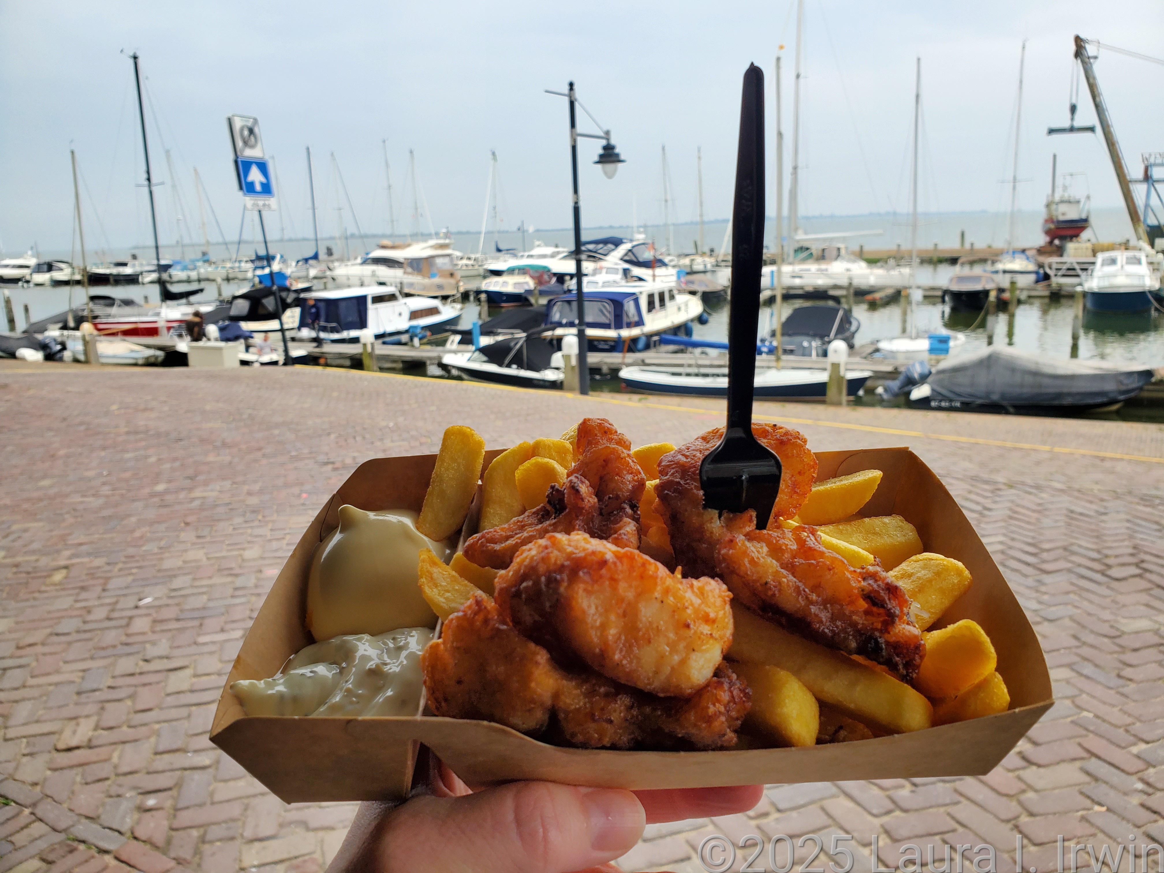 I told myself on this trip I wasn’t going to plan a lot of my meals. I wanted to just find cute cafes and restaurants along the way and stop in one when I felt hungry. Which is how I came to find myself eating fish and chips from a little fish stand (De Haven Volendam) by the edge of the harbor in Volendam. I wasn’t all that hungry so I ate most of the fish and about a third of the fries. The fish came with a local interpretation of tartar sauce while the fries came with the weird sweet mayonnaise (again; when in Rome and all that…). It turns out that winging it for food isn’t really my style, but it worked out today.