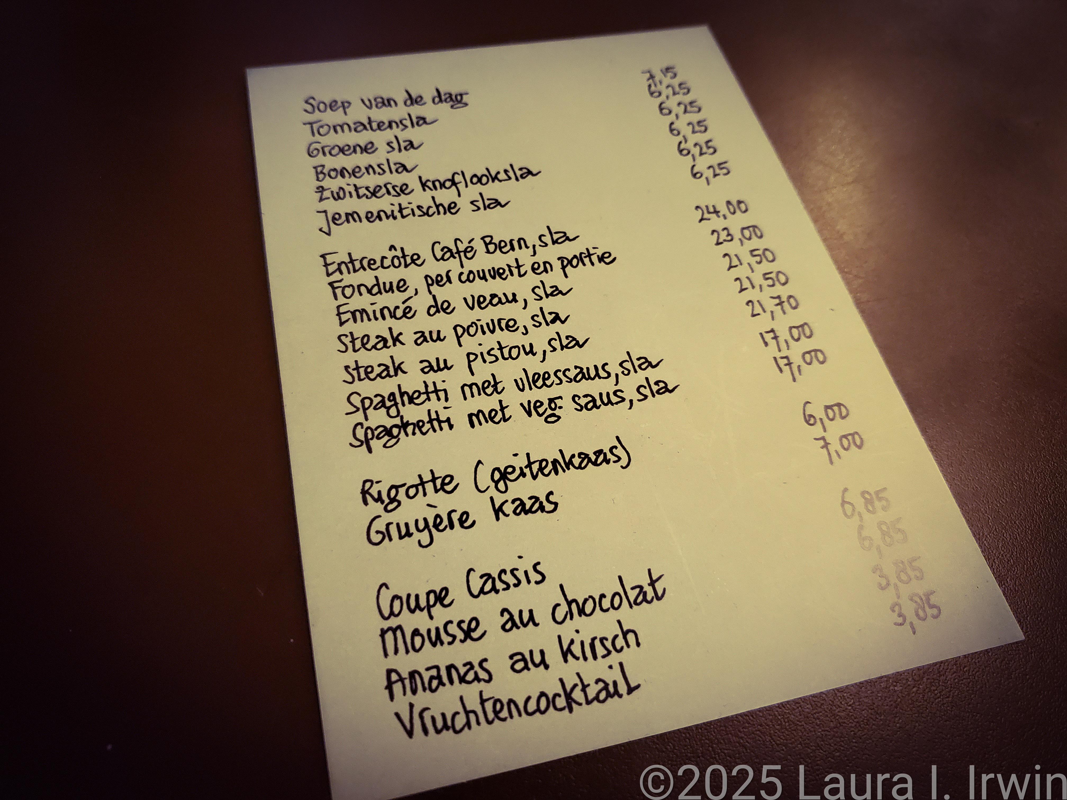 I spent some time back at my hotel just editing pictures this afternoon. Dinner tonight was at Café Bern, a cozy restaurant known for their cheese fondue and steak entrecôte. Since reservations were booked for tonight I settled for a seat at the end of the bar. I really wanted fondue but the bartender convinced me it would be too much food if I ordered that plus the entrecôte. So steak it was. It came with bread and a salad, but the real highlight is cooking the steak yourself at your table. The steak is just seared in the kitchen and then served pretty much raw with a sauce over an oven flame. You decide how long you want to cook it. It was fun to try and the sauce was outstanding.