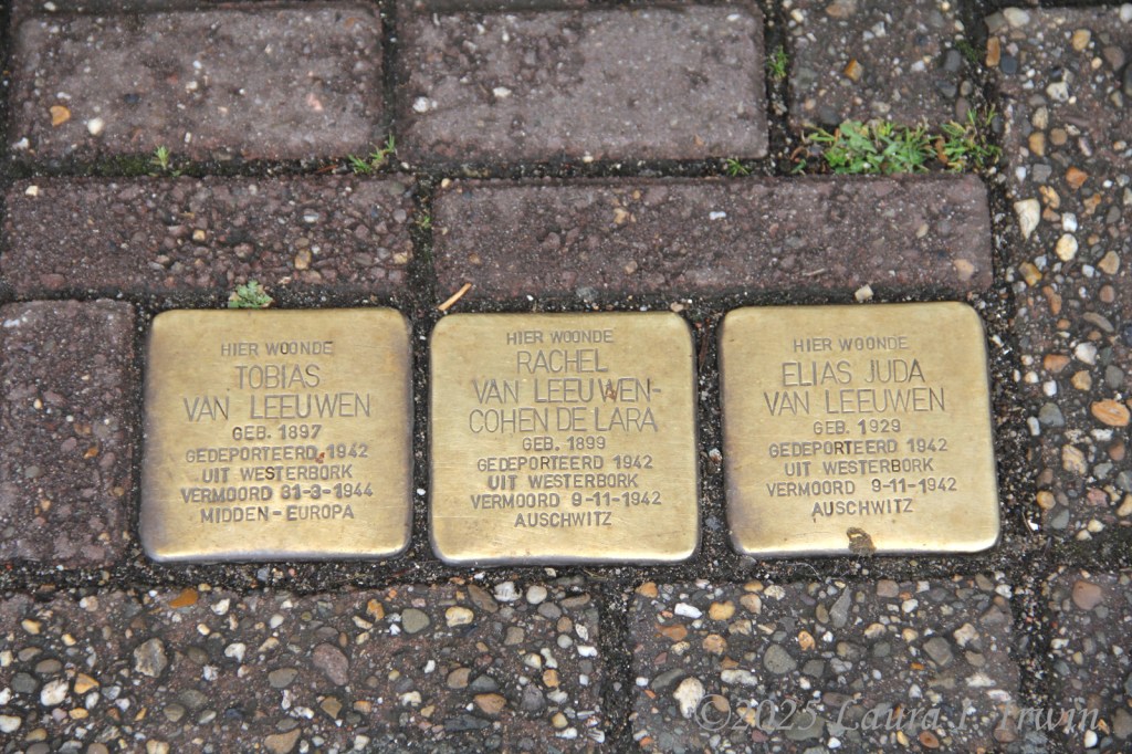 Jewish Memorials All over Amsterdam, there are little gold plaques in the ground (called stolpersteine; meaning “stumbling stones”) as memorials to the Jewish residents who were victims of the Holocaust, frequently placed outside their former homes.