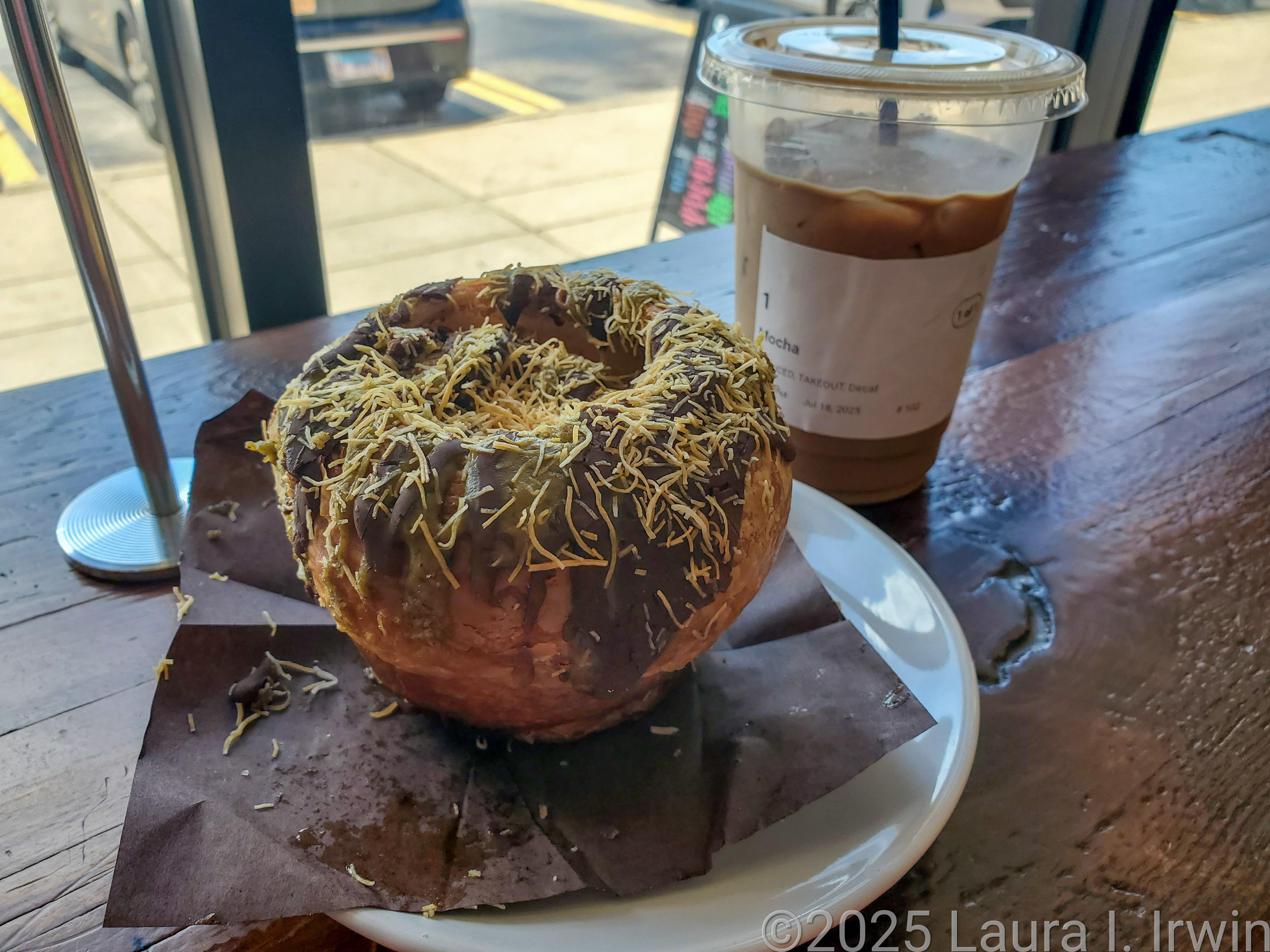 I had to rearrange my travel thanks to a change in the gymnastics schedule, which meant leaving Orlando on an 8:30AM flight yesterday so I could be here in time to attend the junior session last night (rescheduled from this afternoon). I arrived in Chicago, picked up my rental car, and immediately headed to Schaumburg, where I jumped on the Dubai chocolate bus. Having never indulged in a Dubai chocolate anything, I tried a Dubai chocolate “cruffin” at Sweet Reserve Bakery along with an iced mocha. It was big and messy, but I didn’t dislike the flavor combination.