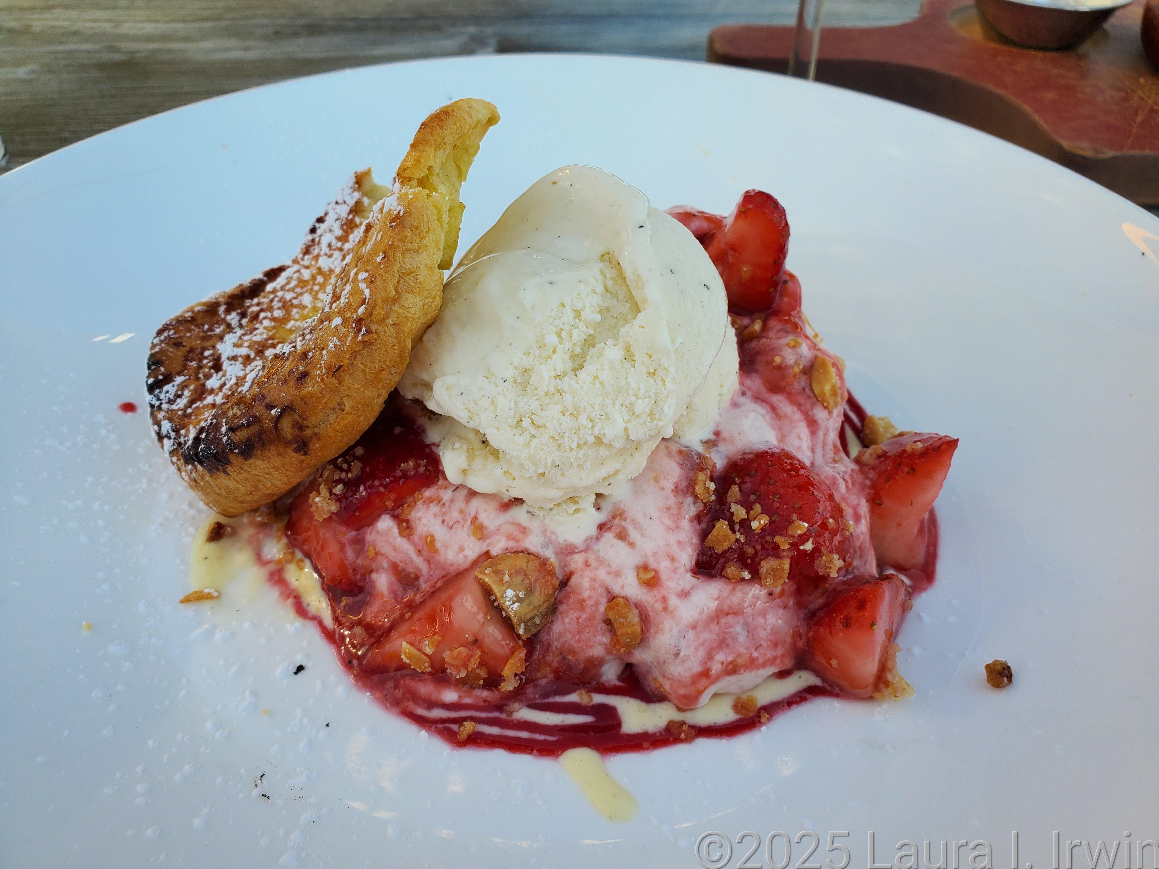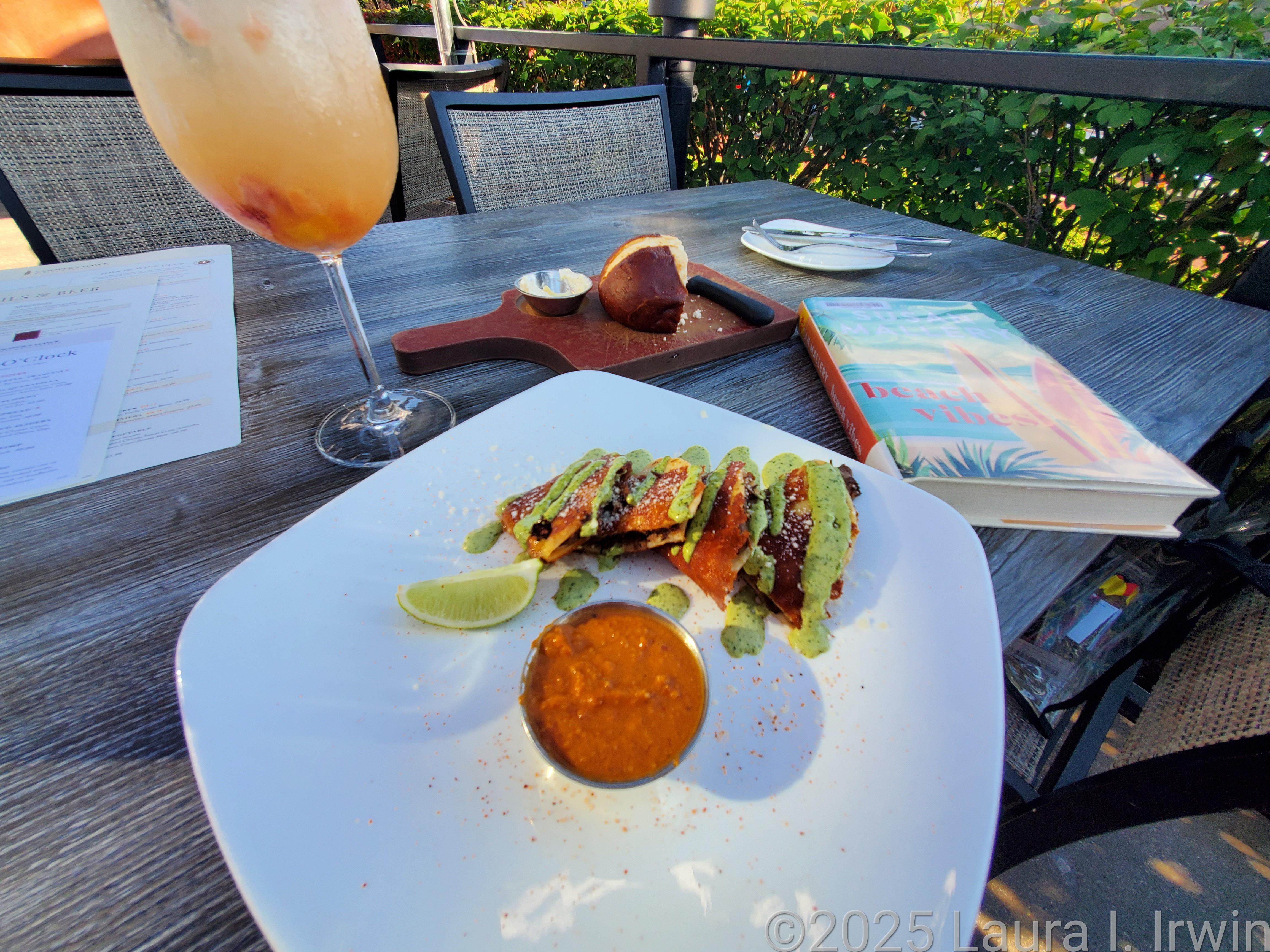 I headed to my hotel and was able to check in early and take a nap before having one of the most delicious meals I’ve had in a long time at Cooper’s Hawk Winery in South Barrington. I had a table in the shade of an umbrella on the outdoor patio, and the 80 degree temperature was a welcome reprieve from the heat and humidity of the last few days in Florida. I had a peach sangria, a crispy barbacoa quesadilla (caramelized cheese crust!), and a popover filled with strawberries, ice cream, crème anglaise, and white chocolate. Aside from the quesadilla being a happy hour portion, it was amazing and if I lived here, I would be eating there all the time.